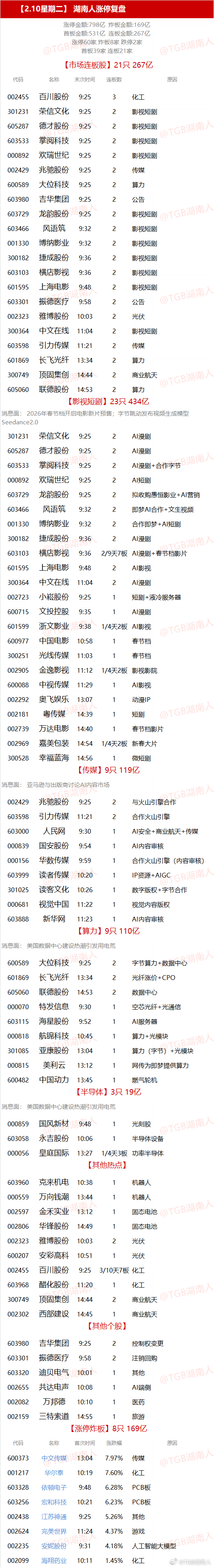 【2.10星期二】 湖南人涨停复盘 "涨停金额:798亿 炸板金额:169亿首板金额:531亿 连板金额:267亿涨停60家 炸板8家 跌停2家首板39家 连板21家" 【市场连板股】21只 267亿 代码 名称 末次时间 连板数 原因002455 百川股份 9:25 3 化工301231 荣信文化 9:25 2 影视短剧605287 德才股份 9:25 2 影视短剧603533 掌阅科技 9:25 2 影视短剧000892 欢瑞世纪 9:25 2 影视短剧002429 兆驰股份 9:25 2 传媒600589 大位科技 9:25 2 算力603980 吉华集团 9:25 2 公告603729 龙韵股份 9:25 2 影视短剧603466 风语筑 9:32 2 影视短剧001330 博纳影业 9:32 2 影视短剧300182 捷成股份 9:36 2 影视短剧603103 横店影视 9:36 2 影视短剧601595 上海电影 9:48 2 影视短剧603301 振德医疗 9:58 2 公告002323 雅博股份 10:03 2 光伏300364 中文在线 11:04 2 影视短剧603598 引力传媒 11:21 2 传媒601869 长飞光纤 13:34 2 算力300749 顶固集创 14:44 2 商业航天605060 联德股份 14:53 2 算力【影视短剧】23只 434亿 消息面: 2026年春节档开启电影新片预售;字节跳动发布视频生成模型Seedance2.0 301231 荣信文化 9:25 2 AI漫剧605287 德才股份 9:25 2 AI漫剧603533 掌阅科技 9:25 2 AI漫剧+合作字节000892 欢瑞世纪 9:25 2 AI短剧603729 龙韵股份 9:25 2 拟收购愚恒影业+AI营销603466 风语筑 9:32 2 即梦AI合作+文生视频001330 博纳影业 9:32 2 合作即梦+AI短剧300182 捷成股份 9:36 2 AI漫剧603103 横店影视 9:36 2/9天7板 AI漫剧+春节档影片601595 上海电影 9:48 2 AI影视300364 中文在线 11:04 2 AI漫剧002723 小崧股份 9:25 1 短剧+液冷服务器600715 文投控股 9:35 1 AI漫剧601599 浙文影业 9:38 1/4天2板 AI影视600977 中国电影 10:58 1 春节档300251 光线传媒 11:03 1 春节档002905 金逸影视 11:12 1/4天2板 影视影院600088 中视传媒 11:29 1 AI影视002292 奥飞娱乐 13:07 1 动漫IP002181 粤传媒 14:39 1 短剧002739 万达电影 14:40 1 春节档影片002969 嘉美包装 14:54 1/4天2板 新春大片300528 幸福蓝海 14:56 1 微短剧【传媒】9只 119亿 消息面: 亚马逊与出版商讨论AI内容市场 002429 兆驰股份 9:25 2 与火山引擎合作603598 引力传媒 11:21 2 合作火山引擎603000 人民网 9:30 1 AI安全+商业航天+传媒000839 国安股份 9:54 1 AI内容审核000156 华数传媒 9:59 1 合作火山引擎(内容审核)603999 读者传媒 10:20 1 IP资源+AIGC301025 读客文化 10:26 1 数字版权+字节合作000681 视觉中国 11:22 1 视觉内容版权603888 新华网 11:23 1 AI内容审核【算力】9只 110亿 消息面: 美国数据中心建设热潮引发用电荒 600589 大位科技 9:25 2 字节算力+数据中心601869 长飞光纤 13:34 2 光纤涨价+CPO605060 联德股份 14:53 2 数据中心000070 特发信息 9:30 1 空芯光纤+光通信603115 海星股份 9:52 1 AI服务器000818 航锦科技 10:45 1 算力+光模块301085 亚康股份 13:04 1 算力(字节)+光模块000815 美利云 13:12 1 网传为即梦提供算力600482 中国动力 13:45 1 燃气轮机【半导体】3只 19亿 消息面: 美国数据中心建设热潮引发用电荒 000859 国风新材 9:48 1 光刻胶603058 永吉股份 10:06 1 半导体设备000056 皇庭国际 13:27 1/4天3板 功率半导体【其他热点】 603960 克来机电 10:38 1 机器人000559 万向钱潮 13:44 1 机器人002597 金禾实业 13:12 1 固态电池002806 华锋股份 14:49 1 固态电池002323 雅博股份 10:03 2 光伏600207 安彩高科 10:51 1 光伏002455 百川股份 9:25 3/10天7板 化工603968 醋化股份 11:20 1 化工300749 顶固集创 14:44 2 商业航天002302 西部建设 14:45 1 商业航天【其他个股】 603980 吉华集团 9:25 2 控制权变更603301 振德医疗 9:58 2 注销回购603320 迪贝电气 10:01 1 其他002655 共达电声 10:08 1 AI端侧002082 万邦德 10:10 1 医药002159 三特索道 14:55 1 旅游【涨停炸板】8只 169亿 代码 名称 首次时间 涨跌幅 原因600373 中文传媒 13:04 7.97% 传媒001217 华尔泰 10:19 7.60% 化工603328 依顿电子 9:48 6.28% PCB板603256 宏和科技 10:21 6.23% PCB板002438 江苏神通 9:25 5.26% 其他002624 完美世界 11:24 4.37% 游戏002235 安妮股份 9:31 4.18% 人工智能大模型002099 海翔药业 10:11 1.45% 化工
