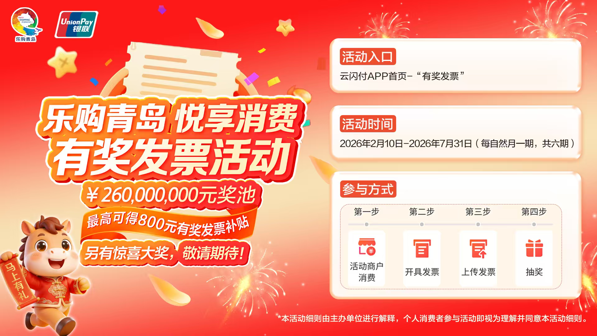 个人消费者在青岛市内指定行业商户单笔消费满100元(含)以上,开具电子发票时,在发票所载“购买方姓名”栏填写与云闪付登录账户信息一致的本人真实姓名,即可参与抽奖。最高可获800元有奖发票补贴,更有惊喜大奖等您开启!每一次日常消费,都可能收获一份“意外之喜”