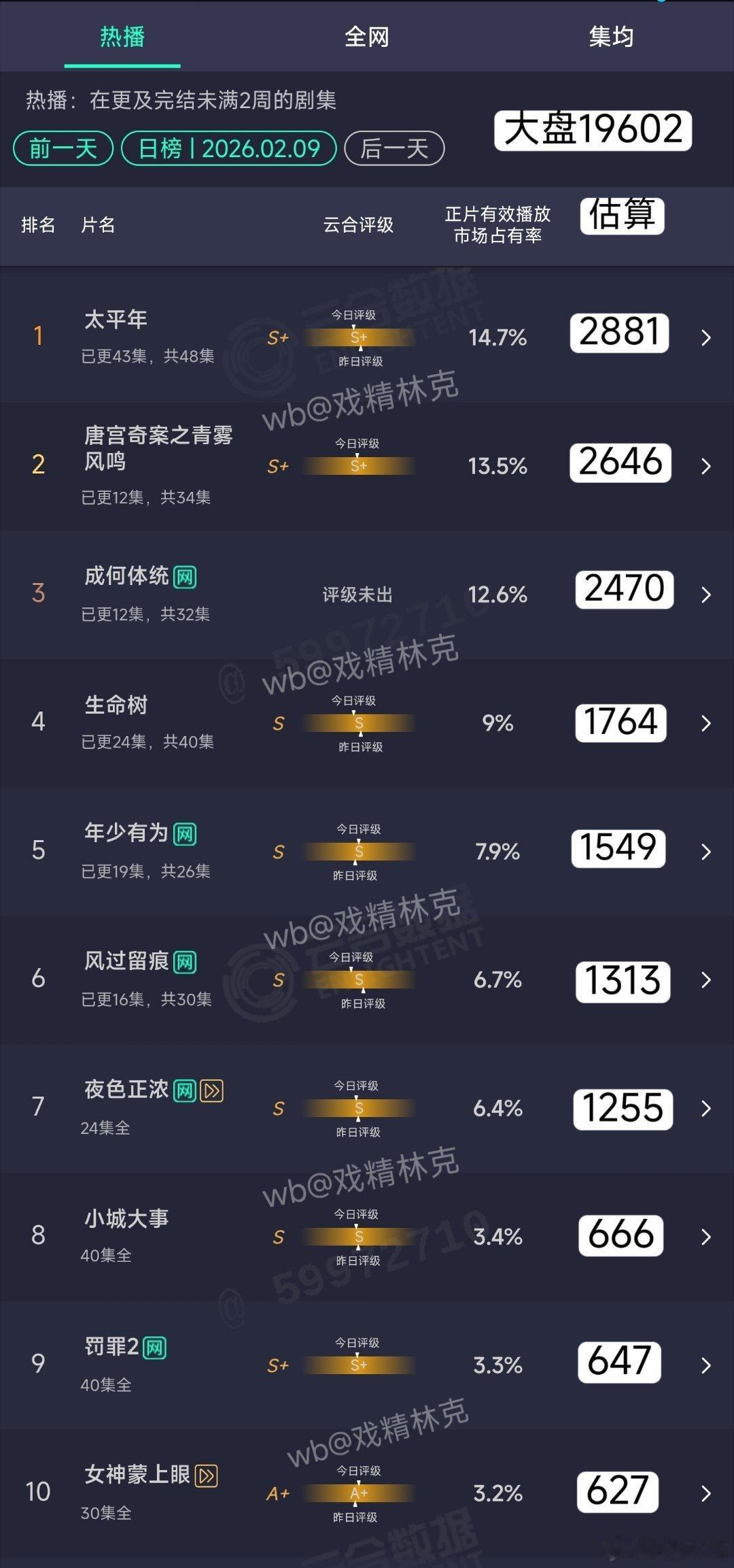 2.09云合: 唐宫奇案13.5%成何体统12.6%
