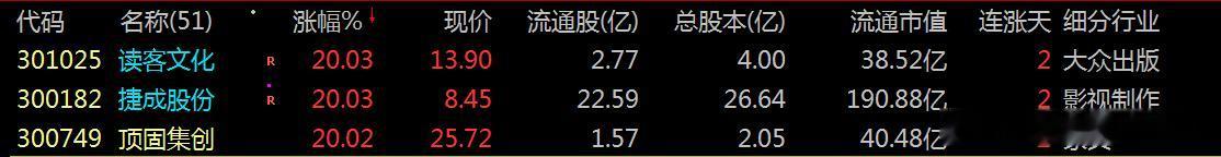 301025 读客文化、301231 荣信文化、601595 上海电影