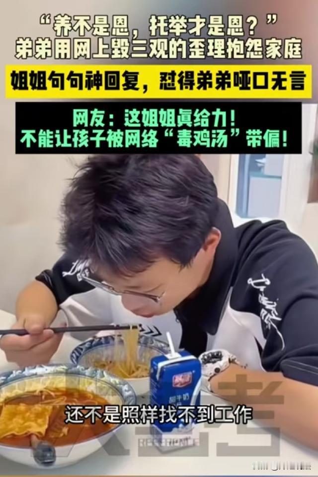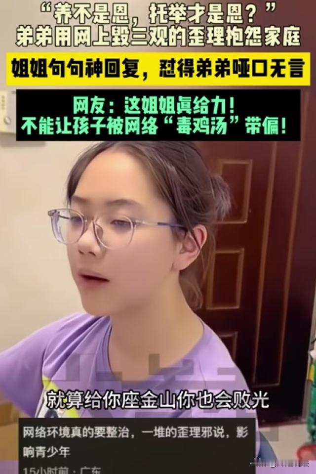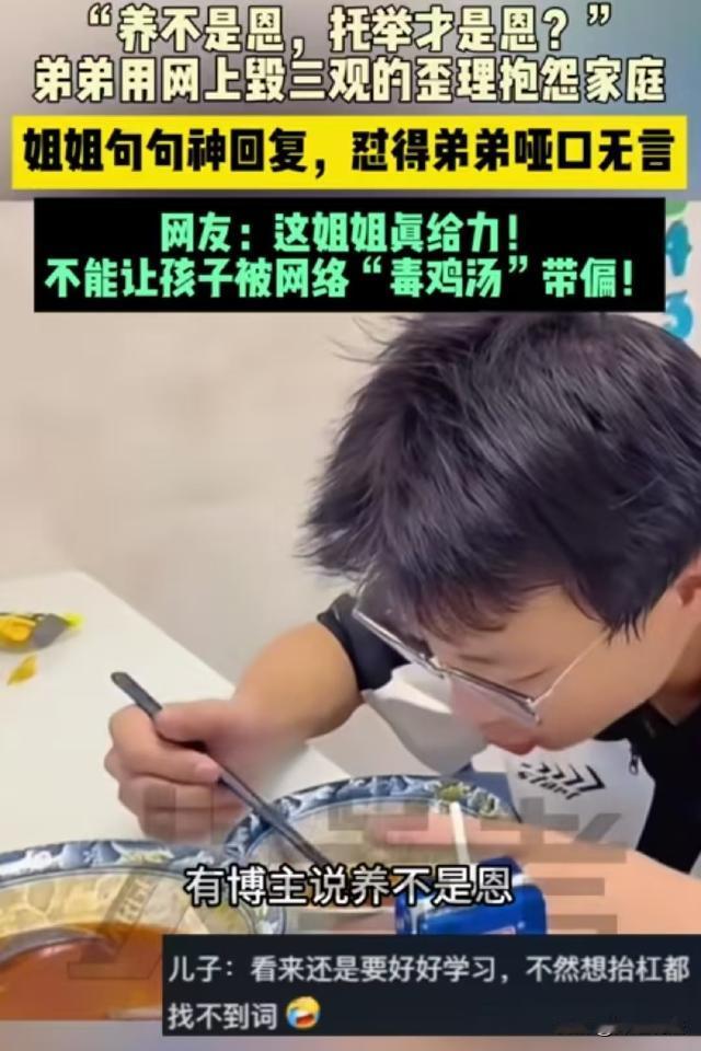 养不是恩,托举才是恩?广东,男孩用网上看来的歪理邪说抱怨原生家庭不好,说读书没用,父母没经过他同意生了他。结果不等父母开口,男孩的姐姐怼了他一通,男孩顿时哑口无言。网友们纷纷鼓掌:这姐姐真给力! 据河南民生频道报道,事情发生在餐桌上,当时,男孩和姐姐正在吃饭。 姐姐问男孩考试考的怎么样,男孩一脸无所谓,姐姐知道,弟弟肯定考的不怎么样。 姐姐语重心长地劝他,让他好好读书,不然以后连个大学都考不上。 谁知道,弟弟一个字都没听进去,反而说读书没有用,很多研究生本科生,照样找不到工作。 姐姐反问弟弟,如果本科生研究生都找不到工作,那你不读书不就更找不到工作了? 弟弟一脸愤愤不平,说不公平,凭什么有的人一出生就什么都有,自己却出生在这么一个普通的家庭里,父母条件不好,就不应该生下他! 姐姐反问他:那你怎么不选择出生在那样的家庭呢? 弟弟说,爸妈生他又没有经过他的同意,他哪有什么权利选择? 姐姐怼弟弟:你学过生物,应该知道是你自己不经过父母同意,跑了第一名,抢着出生好不好? 弟弟顿时不知道怎么回嘴了,姐姐说,爸妈不嫌弃他好吃懒做,好吃好喝把他养到这么大,弟弟还不知道感恩。 弟弟吭哧了半天,突然想到曾经看到的一个视频,于是就拿那个来怼姐姐,说有人说生养不是恩,托举才是恩。 姐姐对弟弟简直无语了,数落他说:你都刷的什么视频啊,爸妈不养不照顾你,你能长这么大?供你读书,教你做人,这还不是托举?你认为托举是什么? 弟弟还是一个少年,很容易被一些歪理邪说带偏,哪里想过这么多?一时之间被姐姐问住了。 姐姐继续说他,难道你认为,你什么都不学什么都不做,爸妈好吃好喝买车买房供你一辈子,这才叫托举? 弟弟想了半天,说给钱创业也可以啊! 姐姐蔑视的笑了一下,说弟弟一个连自己生活都打理不好的人,好吃懒做,就算给他一座金山,他也会败光。 弟弟被姐姐一通怼,怼得哑口无言。 有人说,弟弟就是被网上的毒鸡汤带偏了,很多青少年长期看这些东西,三观都受到了影响,不知道感恩父母,只知道索取。 有人说,父母把孩子养到18岁就没有抚养义务了,这还是在人类世界中,在动物界,孩子能独立生存,都会被妈妈赶出家。父母把孩子养到18岁还继续供养的,都是托举! 但是托举也是有限度的,有多大能力,出多少力。如果孩子忘了传统孝道,只知道索取不知道回馈,这样的白眼狼,不养也罢! 《民法典》第一千零五十八条规定,夫妻双方平等享有对未成年子女抚养、教育和保护的权利,共同承担对未成年子女抚养、教育和保护的义务。 这其中,抚养义务是最基本的。就像这个案例里,父母要为孩子提供生活所需,好吃好喝把孩子养大,让孩子能健康成长,这是法律规定父母必须做的。 教育义务也不可或缺,父母有责任供孩子读书,教孩子做人的道理。而保护义务则是保障孩子的人身安全和合法权益不受侵害。 网上“养育不是恩,托举才是恩”这个说法,这就是典型的歪理邪说。 父母做到抚养、教育、保护,就已经履行了他们的法定义务。 所谓的“托举”,如果理解成给孩子买车买房、给钱创业,这并不是法律规定的父母必须要做的事。 父母养育孩子,让孩子健康长大,接受良好的教育,就是对孩子最大的恩情。 弟弟因为一些错误观念,抱怨原生家庭,不懂得感恩,这是非常错误的。 他只看到了父母没给自己“托举”到所谓优越的物质条件,却忽略了父母在养育和教育过程中付出的心血。 父母把孩子带到这个世界,尽自己最大的努力去抚养和教育,就已经是最大的恩情了!