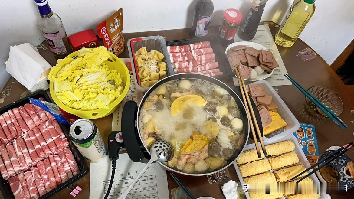 今天儿子说想吃火锅,我们一家三口,好久没吃过了,主要是今年没赚到啥钱,公司效益也不好,工资拖了2个月还没发,又快要过年了,手里没钱心慌,期盼着发工资。 内心很纠结,怪自己没有用,现在混的连一顿火锅,都吃不起了。 以前在外面吃一次,少说也要3、4百元钱,还不敢多点肉吃。 为了不扫儿子的兴,怕他担心家里的窘迫,就高调宣布,我们自己动手在家里吃,理由是家里更卫生,菜品更好,味道也不差。 所以就在菜场、超市来回穿梭,寻找性价比更高的产品,最终买了1斤羊肉+1斤牛肉, 还有肉圆、午餐肉、蛋饺、响铃卷、油豆腐,外加大白菜、金针菇,满满一大桌。 共计花费,200元不到。 最后吃下来,一家都很满意,还有很多菜没吃掉,可以说是相当物美价廉啊! 从今天决定立个目标,以后火锅就在家里吃,怎么也得一个月吃一次。