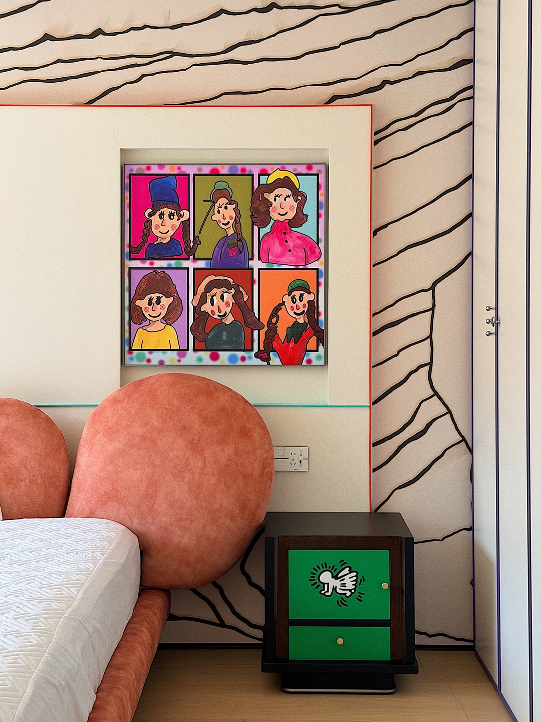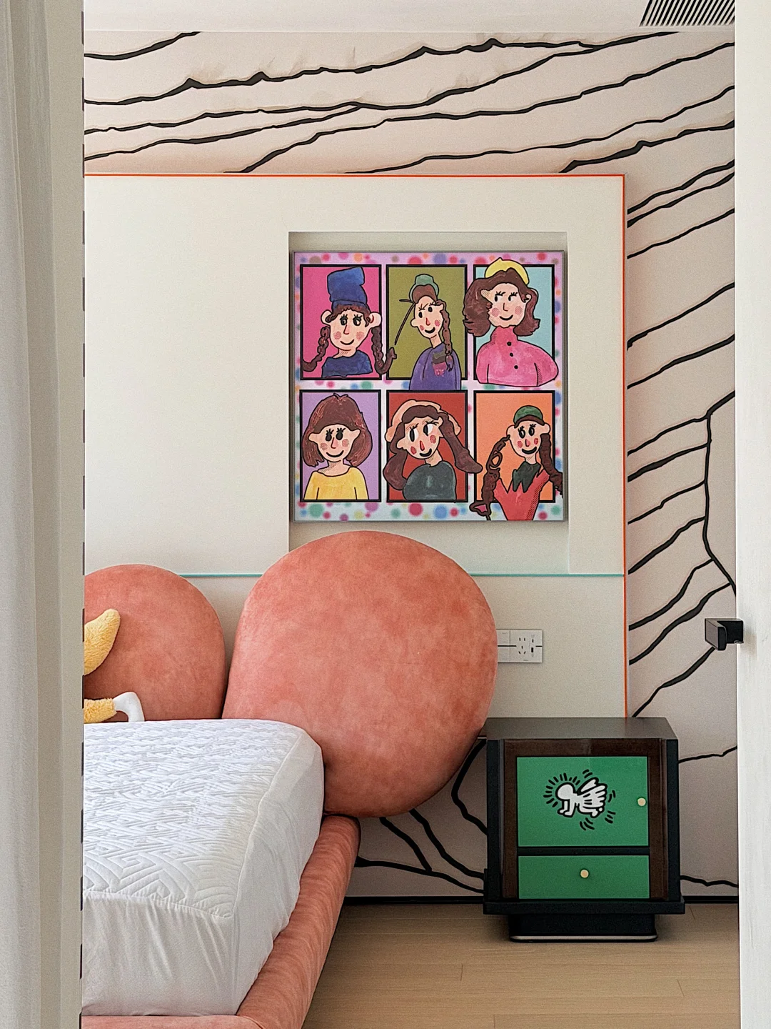 床头那幅六格漫画挂画,色彩饱和度拉满,像从绘本里蹦出来的小伙伴