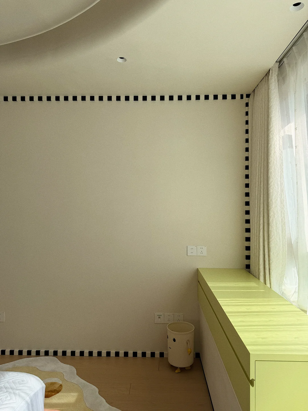 我们把墙面当成了一块巨大的画布:黑白流动的线条是云朵的轮廓