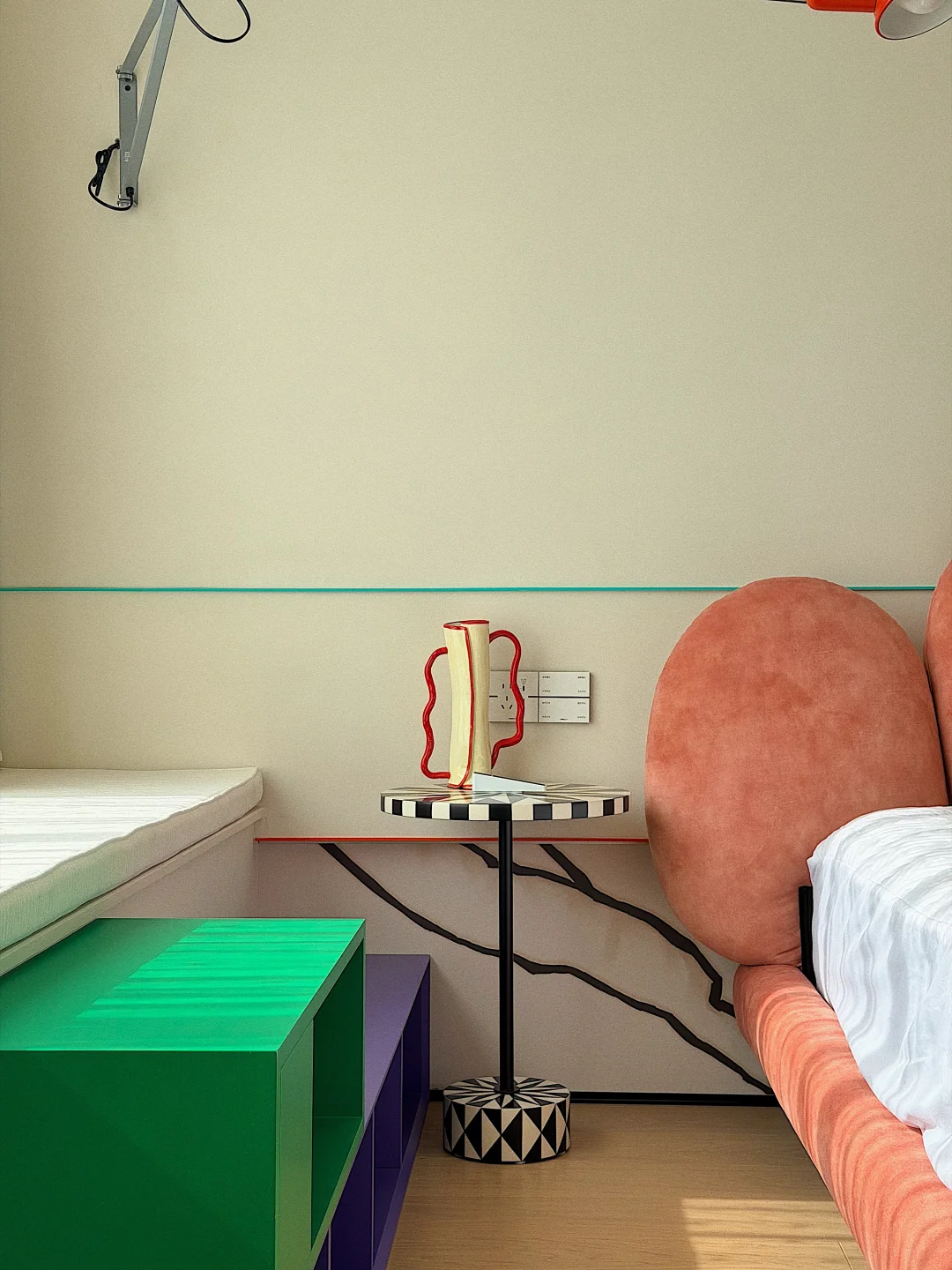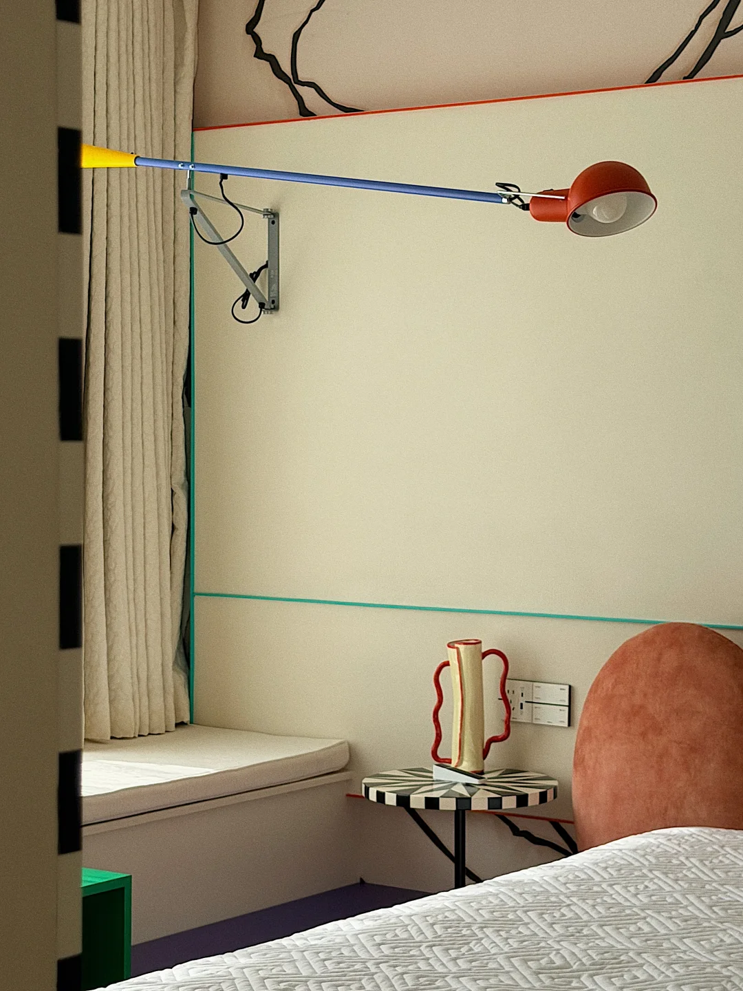 窗边的长杆壁灯,蓝杆红头像一支魔法画笔,随时准备在墙上画出新的故事