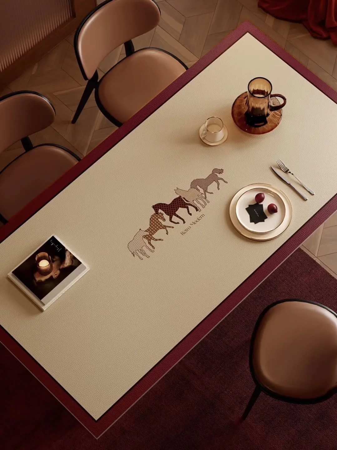 今年春节选了一款马年主题的桌垫 用简约线条勾勒出马的轮廓 几何图形带来干净的现代感 整体以暖杏色为底 边缘缀了一圈酒红色边框 底色柔和温暖 红边则添了几分节日的浓郁氛围 防水防油好打理 特别适合新年餐桌布置 -