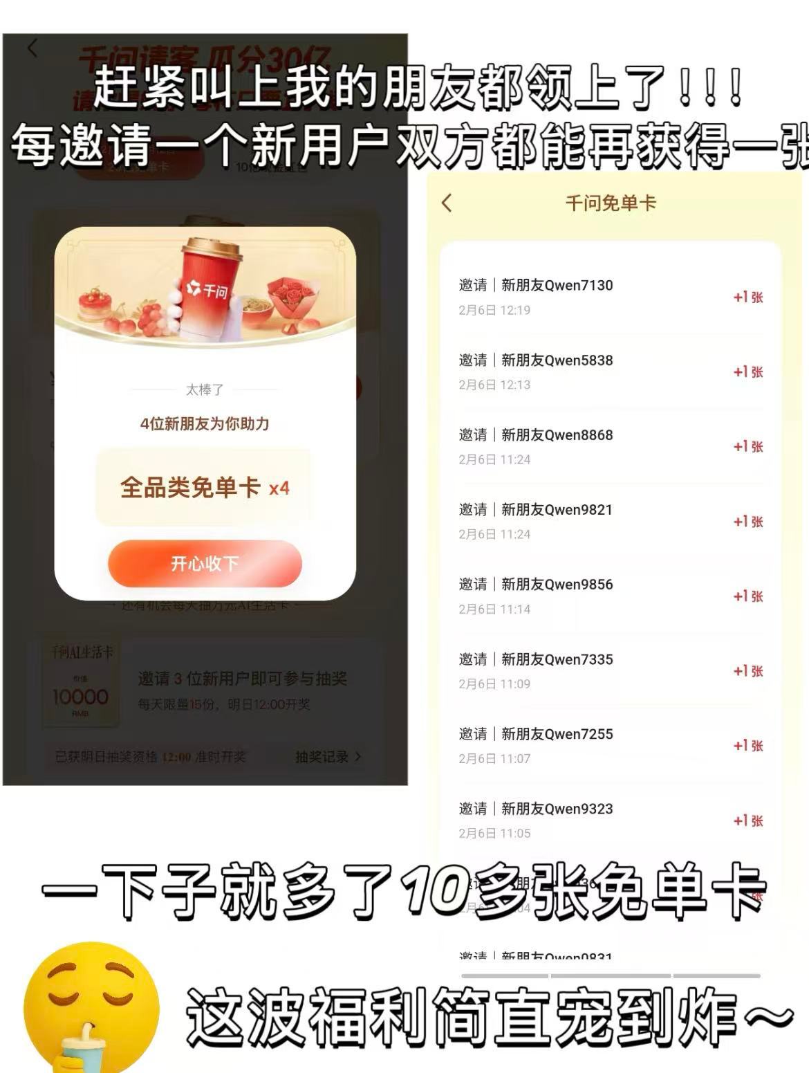 #身边人均十多张免单卡的含金量# 最近身边的朋友都在聊什么?千问免单卡真的是一个硬通货啊!很多人多达21张免单卡,十多张的也有很多。可以说,千问免单卡让一部分人先富起来了,每张可抵25元。点奶茶应该是少数,多数人会过日子的囤年货我就、领鸡蛋了。看到这句话,实在绷不住了——一代人有一代人的鸡蛋要领。