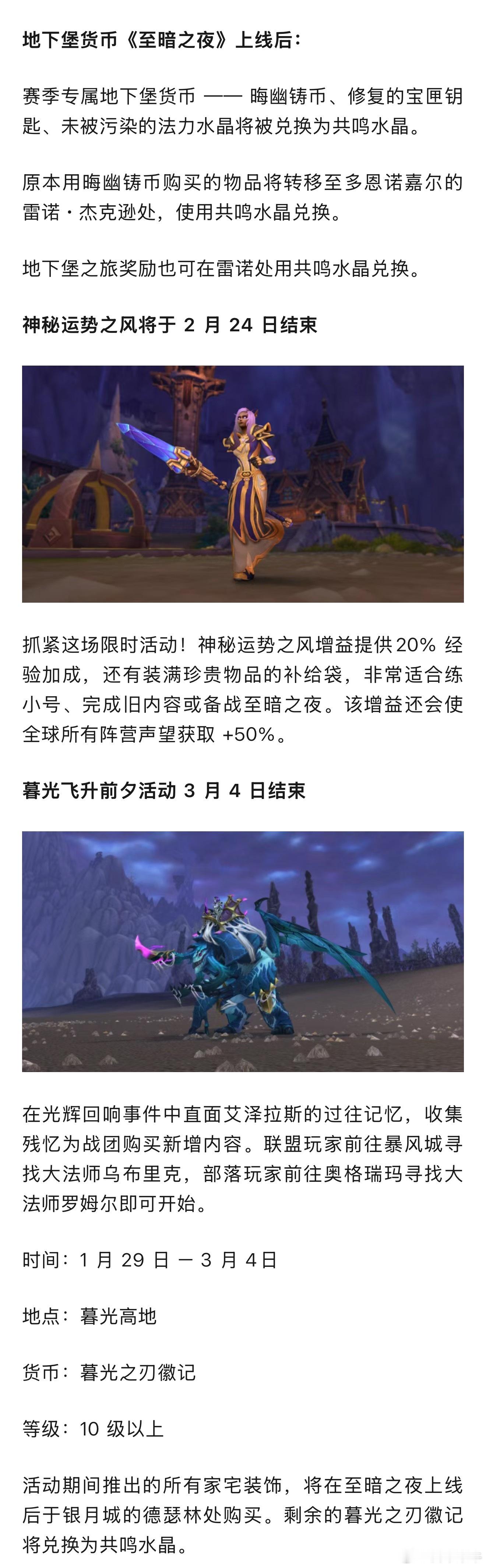 暴雪蓝贴!3月4日更新前必做的事,这些内容暴雪确认绝版!网页链接随着《魔兽世界:地心之战》迎来尾声,我们即将翻开下一篇章:《至暗之夜》。在你的冒险继续前行之前,现在正是收尾卡兹阿加各项内容的最佳时机 —— 尤其是那些将在2026 年 3 月 4 日全球资料片更新上线后,绝版或变得极难获取的奖励与成就。魔兽世界魔兽世界