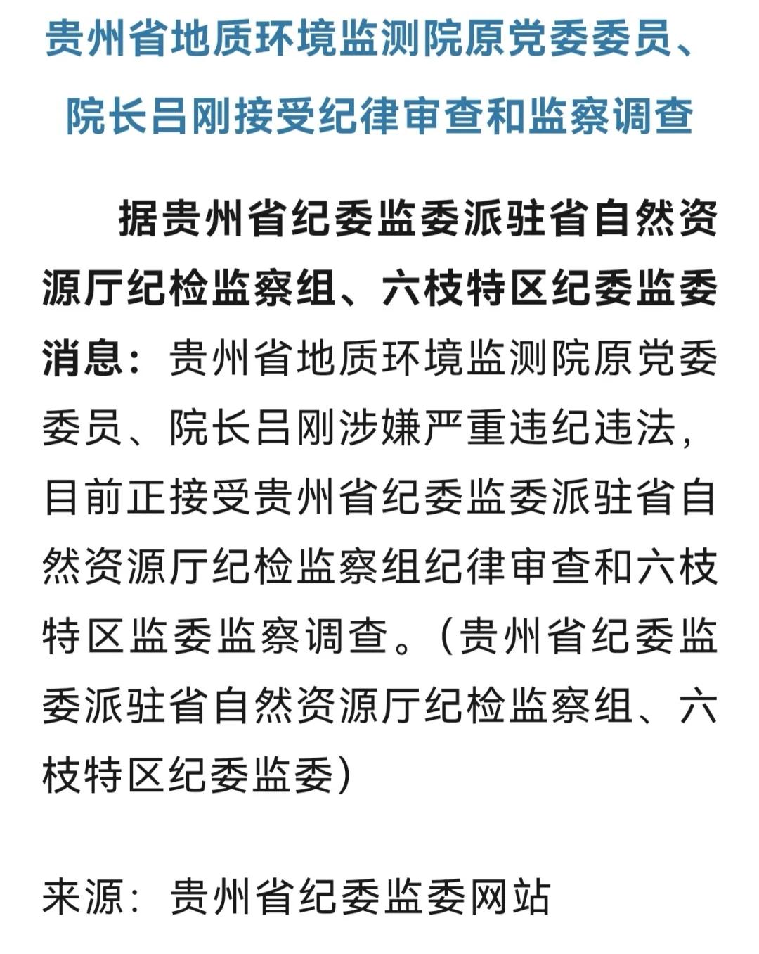 贵州省地质环境监测院的吕刚,今天彻底栽了! 这个吕刚也不简单,他1974年7月出生于贵州德江,曾经毕业于贵州工业大学水文地质与工程地质专业,拥有大学本科学历,而且还是一名技术人员,拥有正高级工程师职称。 从事过工程行业的都知道,这个正高级工程师职称,不是“考”出来的,而是“评”出来的,其评审难度极高,堪称职业发展中的“地狱级挑战”,通过率普遍低于5%。全国正高级职称总数不足副高职称总数的7%。可以说是名额稀缺,竞争激烈。 吕刚能够拥有正高级工程师职称,也说明其一直走的是技术路线,专业能力过硬。 他从大学毕业之后,便进入了地质领域,深耕地质工作30余年,曾担任过111地质大队队长。 2015年4月,被免去地质大队大队长职务。 随后便进入了贵州地质环境监测院,担任贵州地质环境监测院党委委员、院长。负责该院的大小事务。 2019年,省自然资源厅发文,吕刚不再担任贵州省地质环境监测院党委书记职务。但是仍保留党委委员、院长职务。 此后还担任过贵州省地质灾害应急技术指导中心常务副主任。 曾经在履职期间,参与多起重大地灾应急处置,比如2019年水城“7·23”特大山体滑坡灾害中,其作为技术专家组组长,率队赶赴现场开展应急调查与处置。 并且在任职期间负责全省地下水监测工作,2019年带队完成全省218个国家级地下水监测点水质取样。 还有一点值得注意,在今年的1月8日,贵州地质环境监测院还有一人落马,那便是贵州省地质环境监测院原党委委员、总工程师朱要强。 吕刚作为专业技术人员出身,又在贵州地质环境监测院担任院长多年,他本应该以身作则,恪尽职守,廉洁从政,然而却内心贪婪,欲望膨胀,最终也是害人害己,不仅葬送了大好前程,如今更是身败名裂,身陷囹圄,可谓是:贪心不足蛇吞象,竹篮打水一场空。