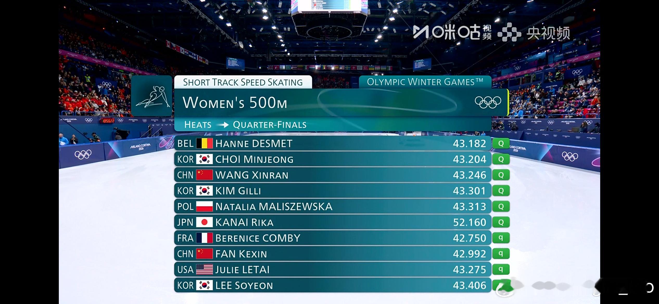女子短道速滑500米预赛范可新42.992,小组第三晋级1/4决赛 中国队王欣然、张楚桐、范可新都顺利晋级下一轮出发道次可能不太好,大家加油💪