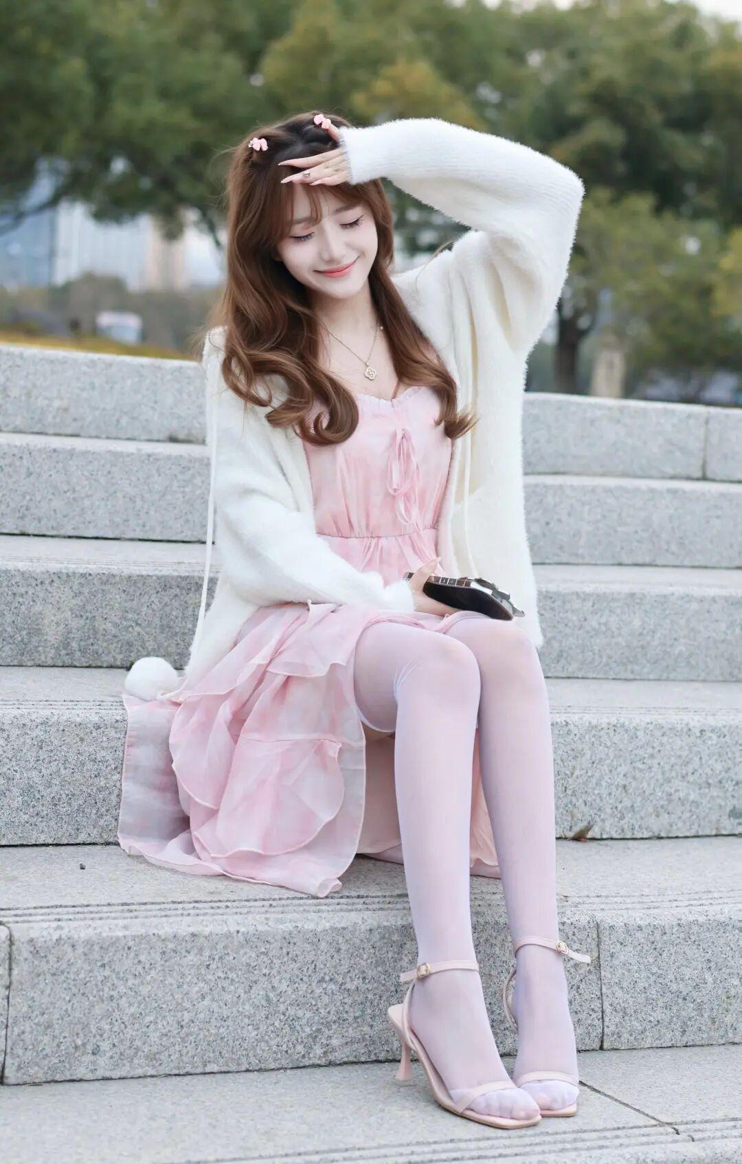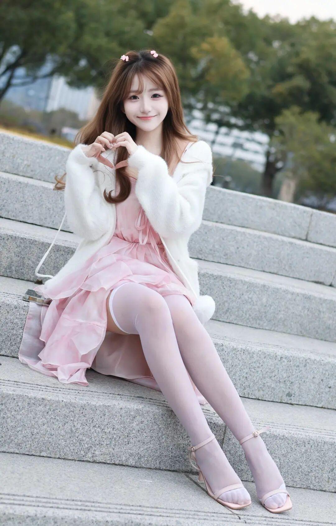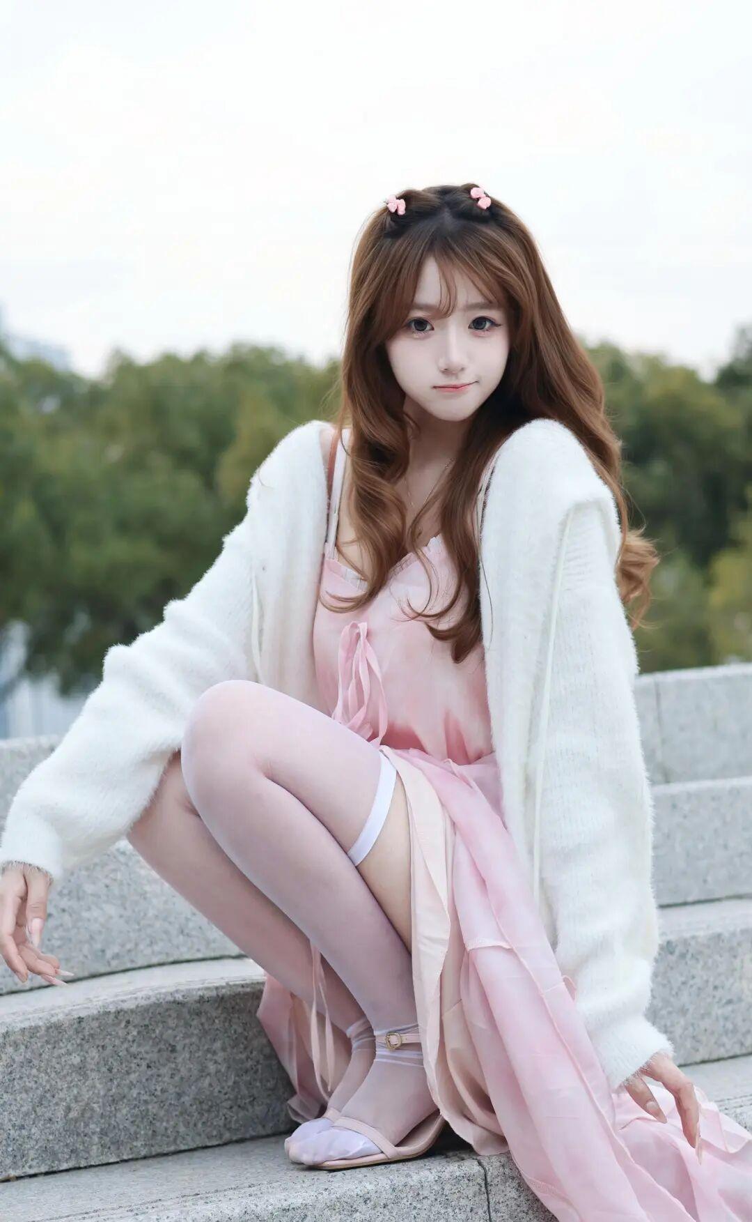 背景是模糊的绿树与远处建筑,营造出清新自然的氛围,阳光柔和地洒在她身上,使整个画面充满春日的浪漫与活力。这种风格常见于时尚街拍或社交媒体分享,旨在展现青春、甜美与自然美的结合。