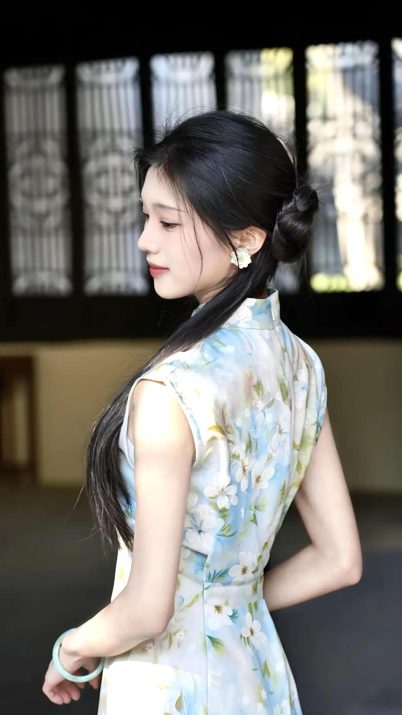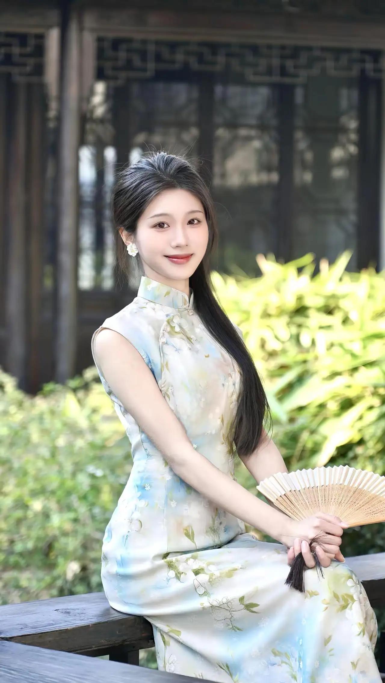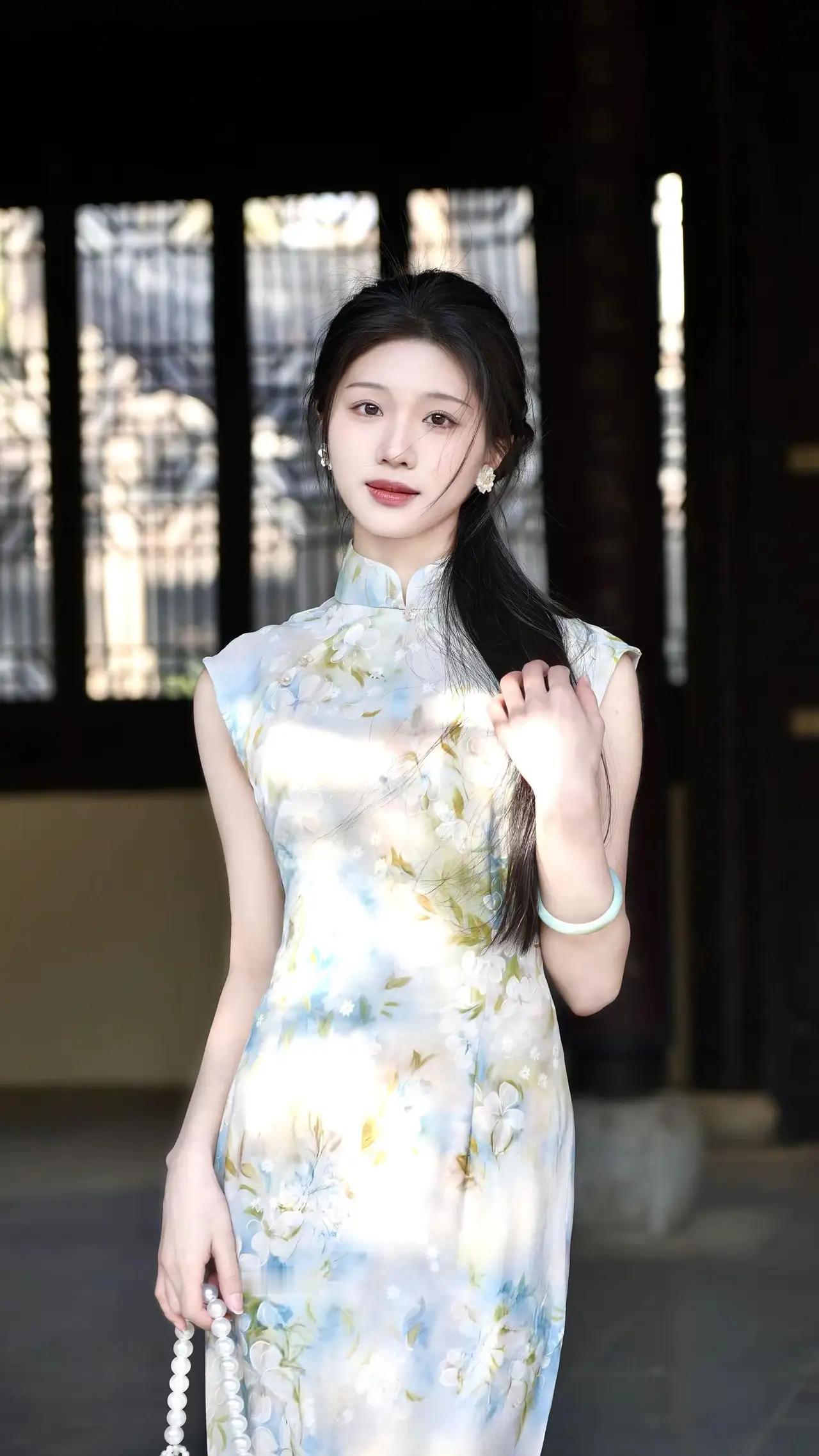 什么样的穿搭可以成为气质女神?这组照片展现了一位年轻女性身着新中式绿色旗袍,在古典园林或庭院环境中拍摄的优雅写真。她身穿浅蓝底色、缀有白色花卉图案的无袖旗袍,搭配珍珠手提包与玉镯,整体造型温婉清新,尽显东方女性的柔美与端庄。 她的长发或披肩或盘起,佩戴花朵耳饰,手持折扇或轻抚发丝,姿态自然舒展,眼神温柔含笑,仿佛从旧时光中走来的江南女子。背景中的雕花木窗、青砖灰瓦与绿植相映成趣,光影透过窗棂洒落,营造出静谧诗意的氛围。 这组作品不仅捕捉了旗袍的古典韵味,更通过现代摄影手法赋予其清新灵动的气质,传递出一种“温润如玉、静水流深”的东方美学意境。