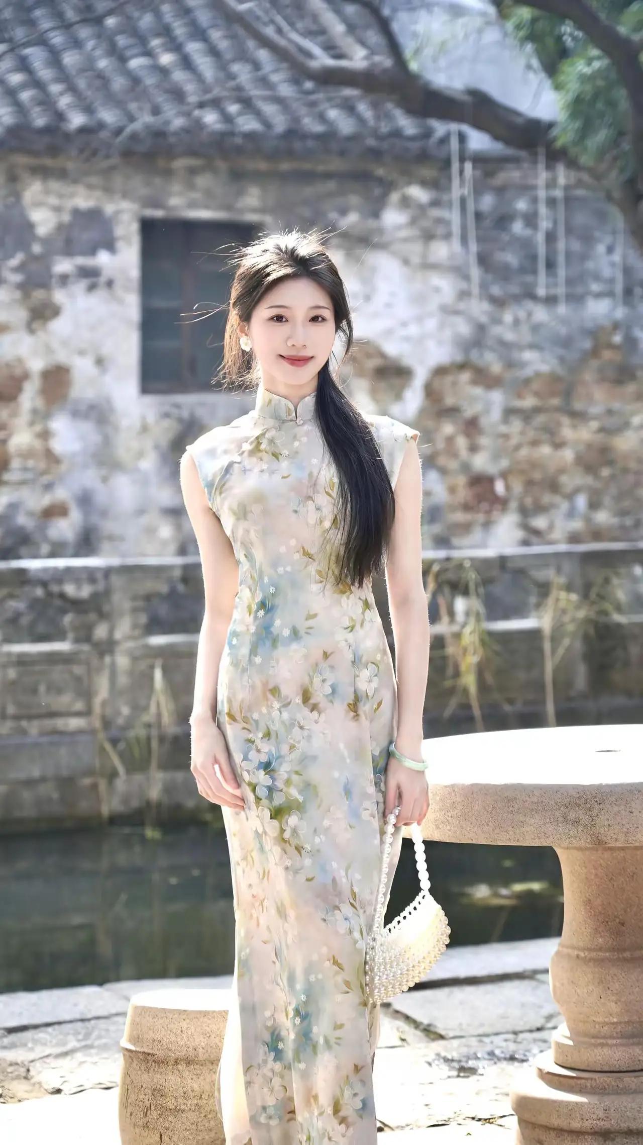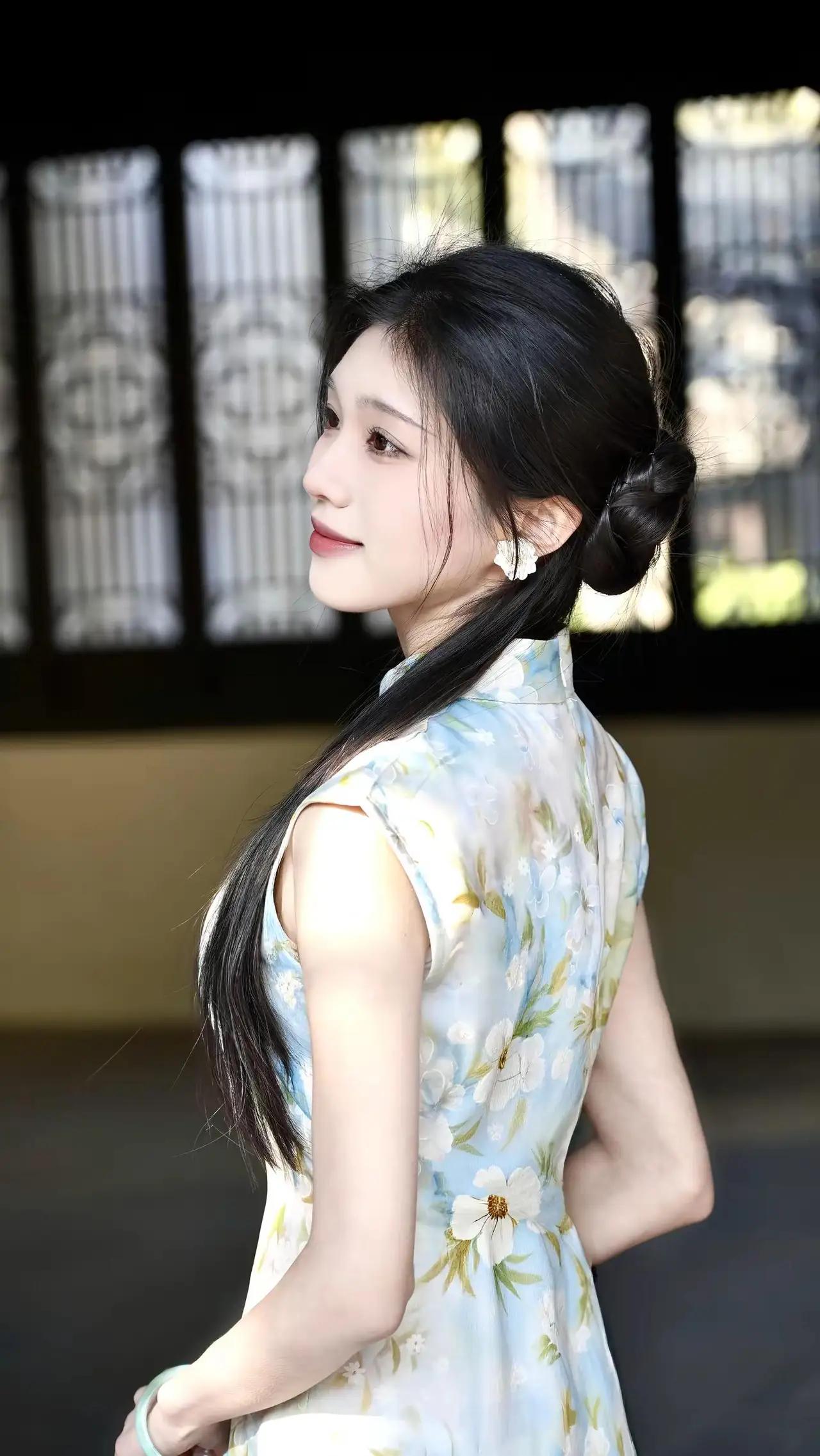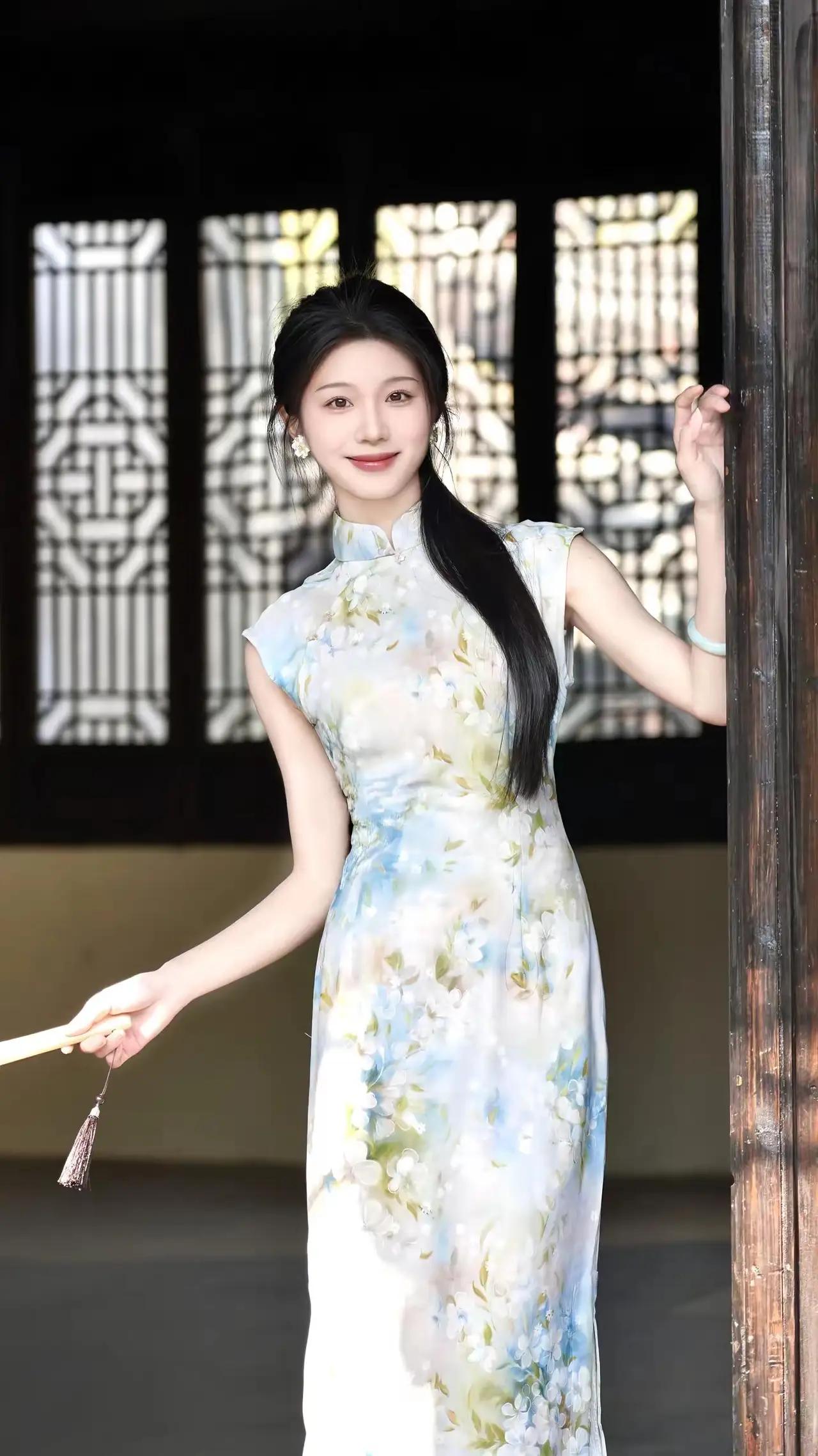 什么样的穿搭可以成为气质女神?这组照片展现了一位年轻女性身着新中式绿色旗袍,在古典园林或庭院环境中拍摄的优雅写真。她身穿浅蓝底色、缀有白色花卉图案的无袖旗袍,搭配珍珠手提包与玉镯,整体造型温婉清新,尽显东方女性的柔美与端庄。 她的长发或披肩或盘起,佩戴花朵耳饰,手持折扇或轻抚发丝,姿态自然舒展,眼神温柔含笑,仿佛从旧时光中走来的江南女子。背景中的雕花木窗、青砖灰瓦与绿植相映成趣,光影透过窗棂洒落,营造出静谧诗意的氛围。 这组作品不仅捕捉了旗袍的古典韵味,更通过现代摄影手法赋予其清新灵动的气质,传递出一种“温润如玉、静水流深”的东方美学意境。