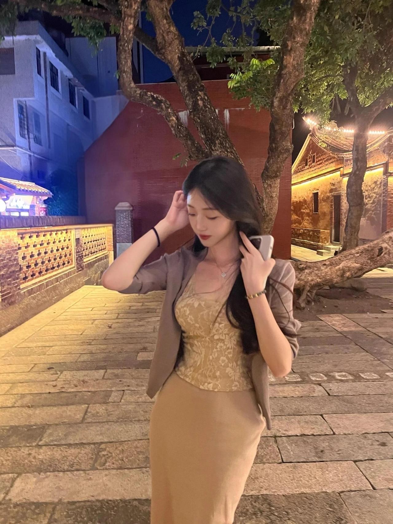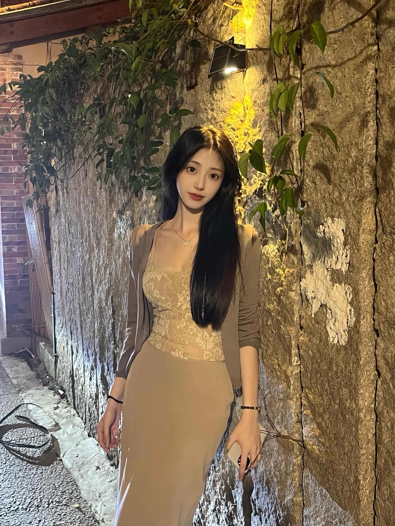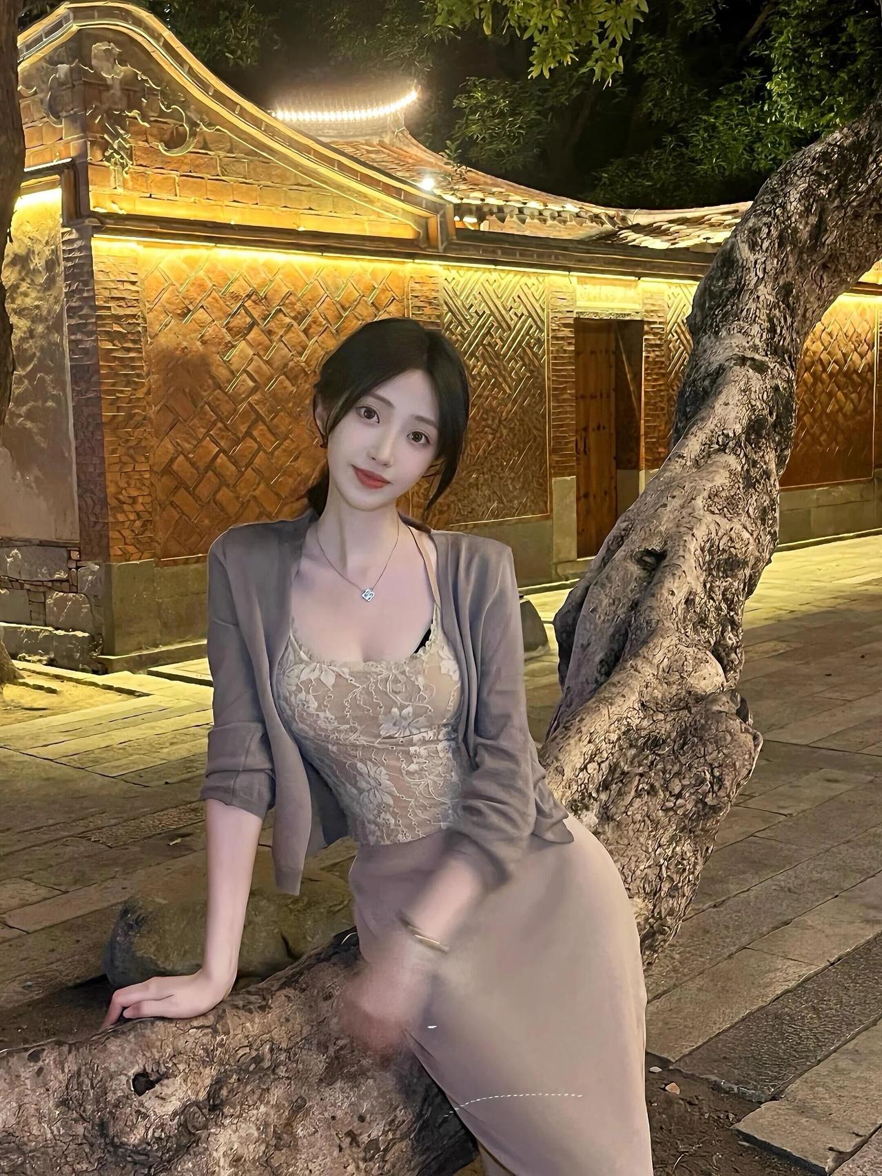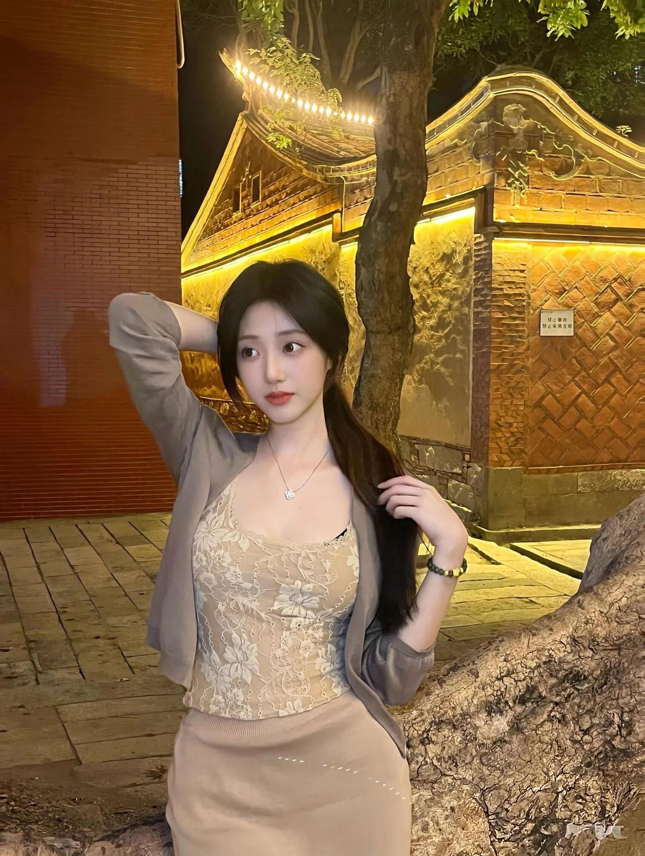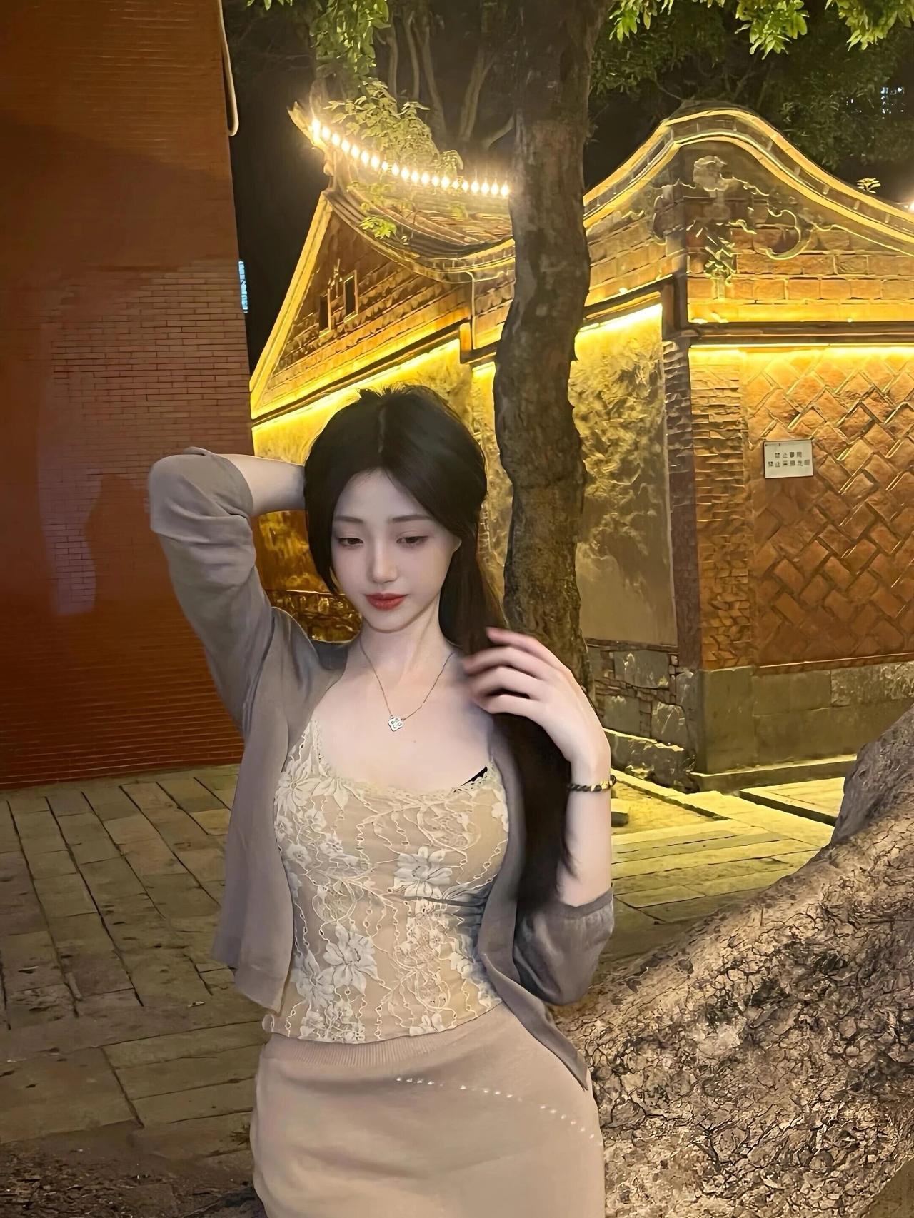 暮色四合,古厝的飞檐在暖黄灯光下勾勒出温柔的轮廓,青石板路旁的老树,将时光的纹路刻进年轮。她倚在斑驳的墙边,蕾丝吊带裙的柔光与夜色交融,外搭的薄衫随晚风轻扬,发丝在光影里流转着丝绸般的光泽。 指尖轻触发梢,笑意在唇边漾开,这一刻,仿佛连晚风都放慢了脚步。夜色温柔,岁月静好,她与这方古韵天地,共赴一场静谧的浪漫。