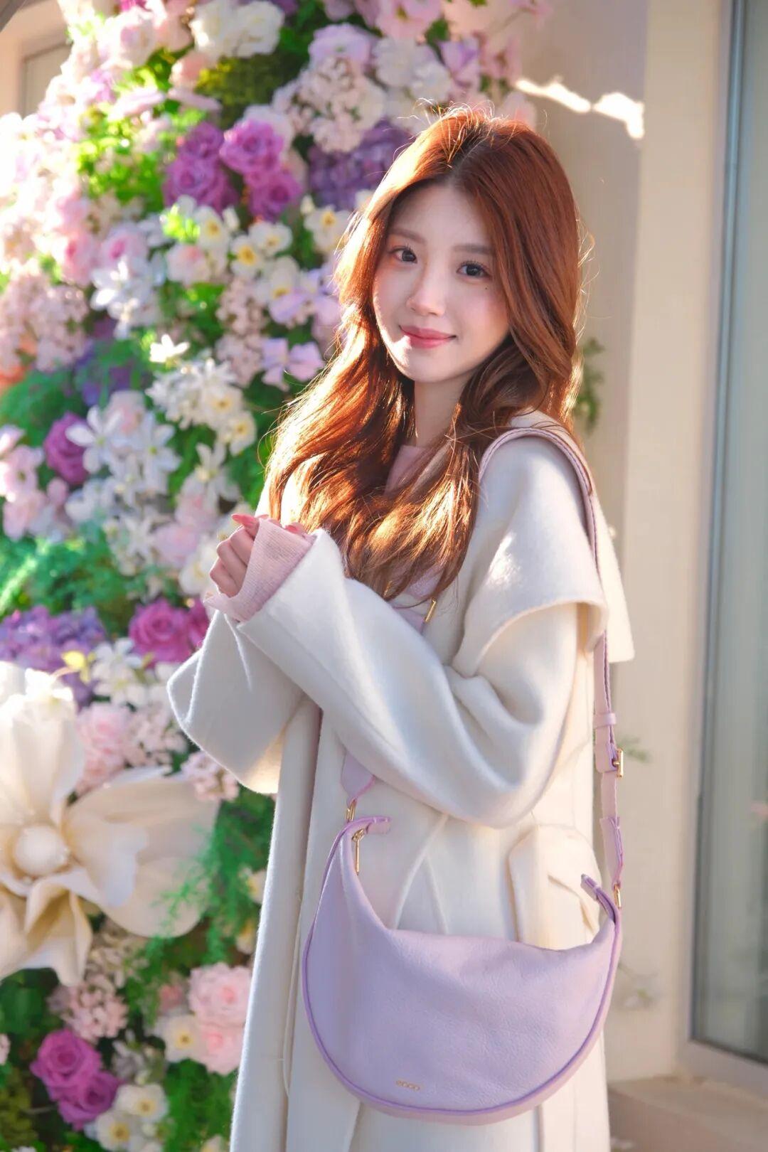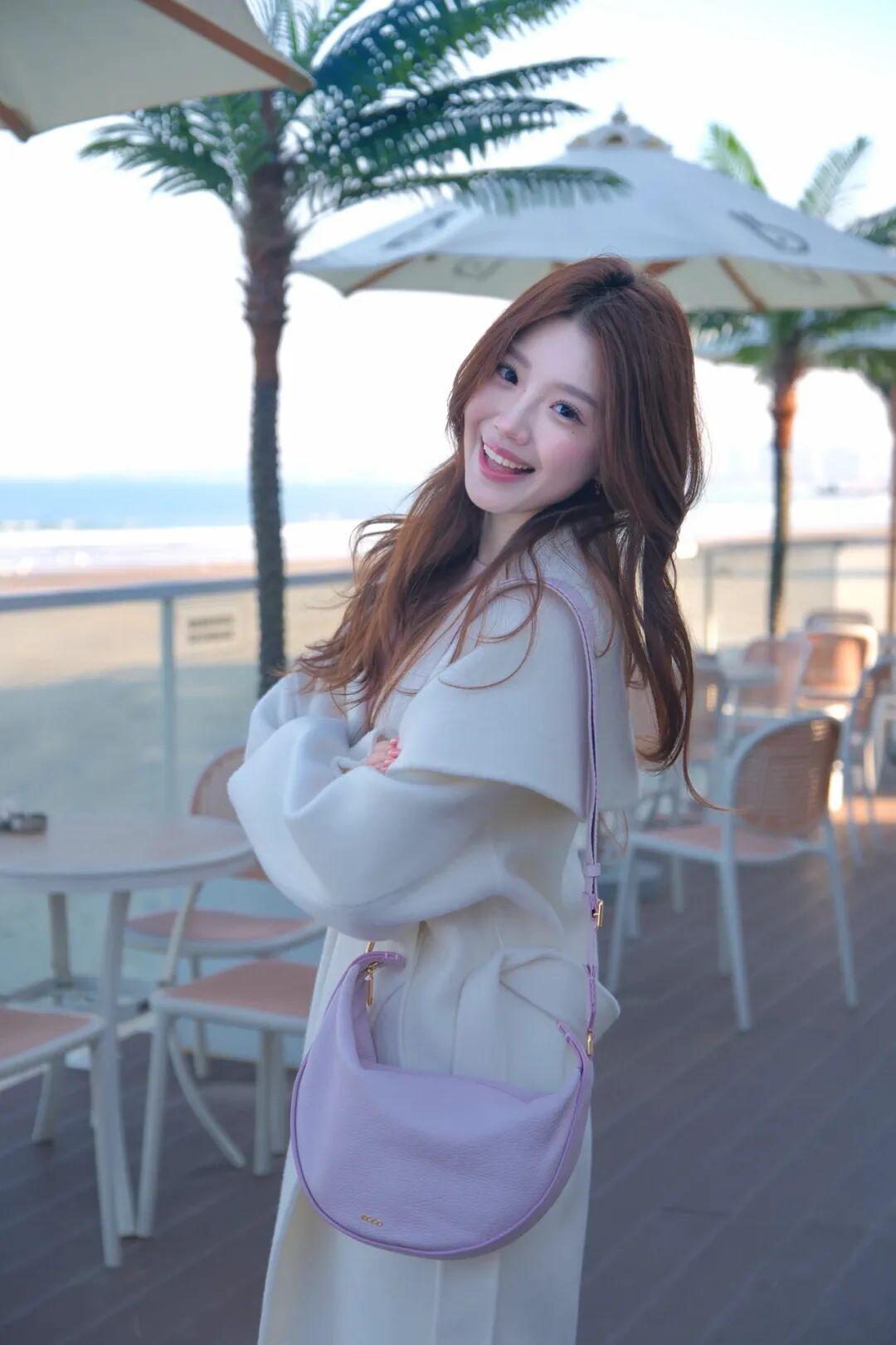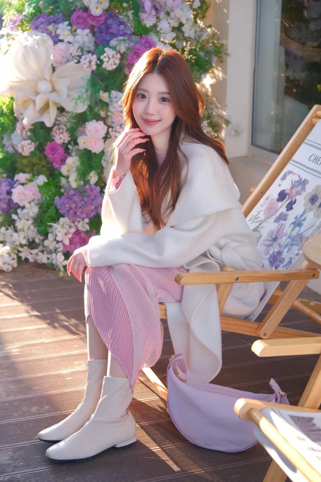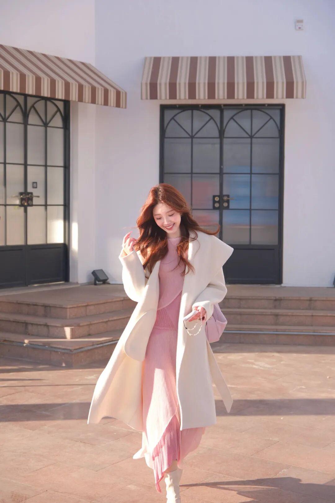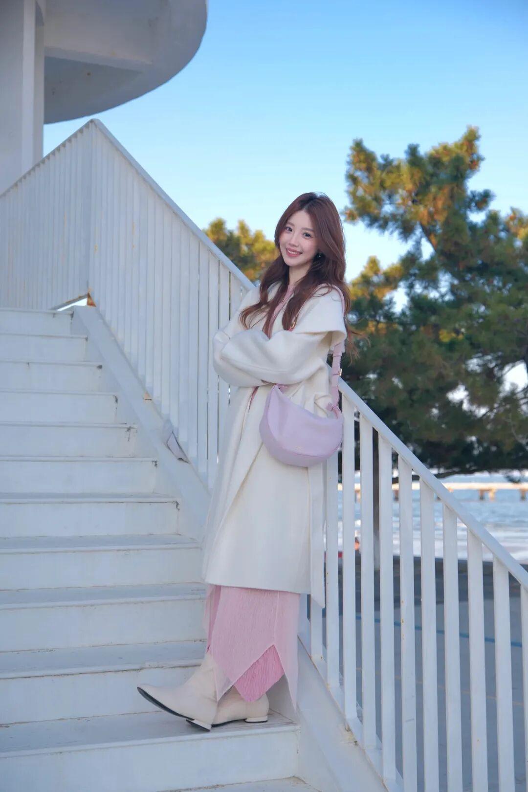 什么样的穿搭可以成为气质女神?这组照片展现了一位年轻女性在户外阳光下的多个瞬间,整体风格清新甜美,充满冬日暖阳的温柔氛围。 她身穿米白色长款大衣,内搭粉色针织连衣裙,脚踩同色系短靴,肩挎淡紫色半月形包包,整体配色柔和统一,营造出温柔优雅的视觉效果。她的长发自然垂落,发色偏暖棕,与阳光下的光影相得益彰,笑容灿烂,眼神明亮,展现出轻松愉悦的情绪。 背景多为户外场景,包括红砖建筑、白色楼梯、花墙、棕榈树和露天咖啡座,环境明亮开阔,阳光充足,营造出度假般的轻松氛围。部分画面中,她或倚靠栏杆、或坐在台阶上、或在花墙前摆拍,姿态自然,动作轻盈,展现出活泼与优雅并存的气质。 这组照片不仅记录了她美好的瞬间,也通过服装、配饰与环境的搭配,传递出一种温暖、浪漫、充满活力的生活态度,仿佛在诉说一个关于冬日阳光与美好时光的故事。