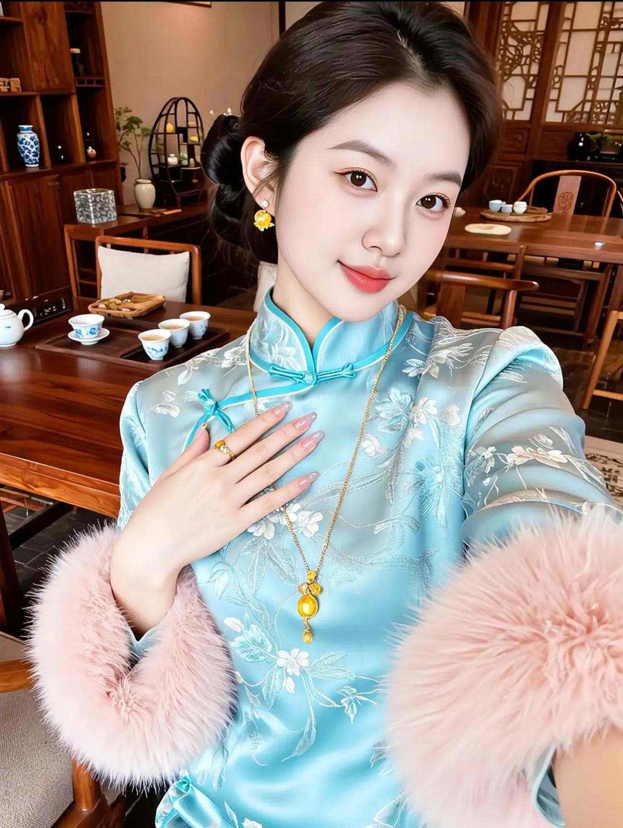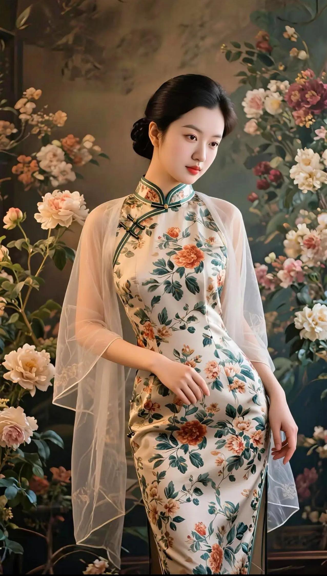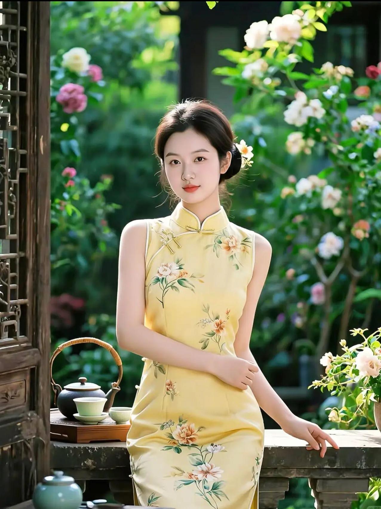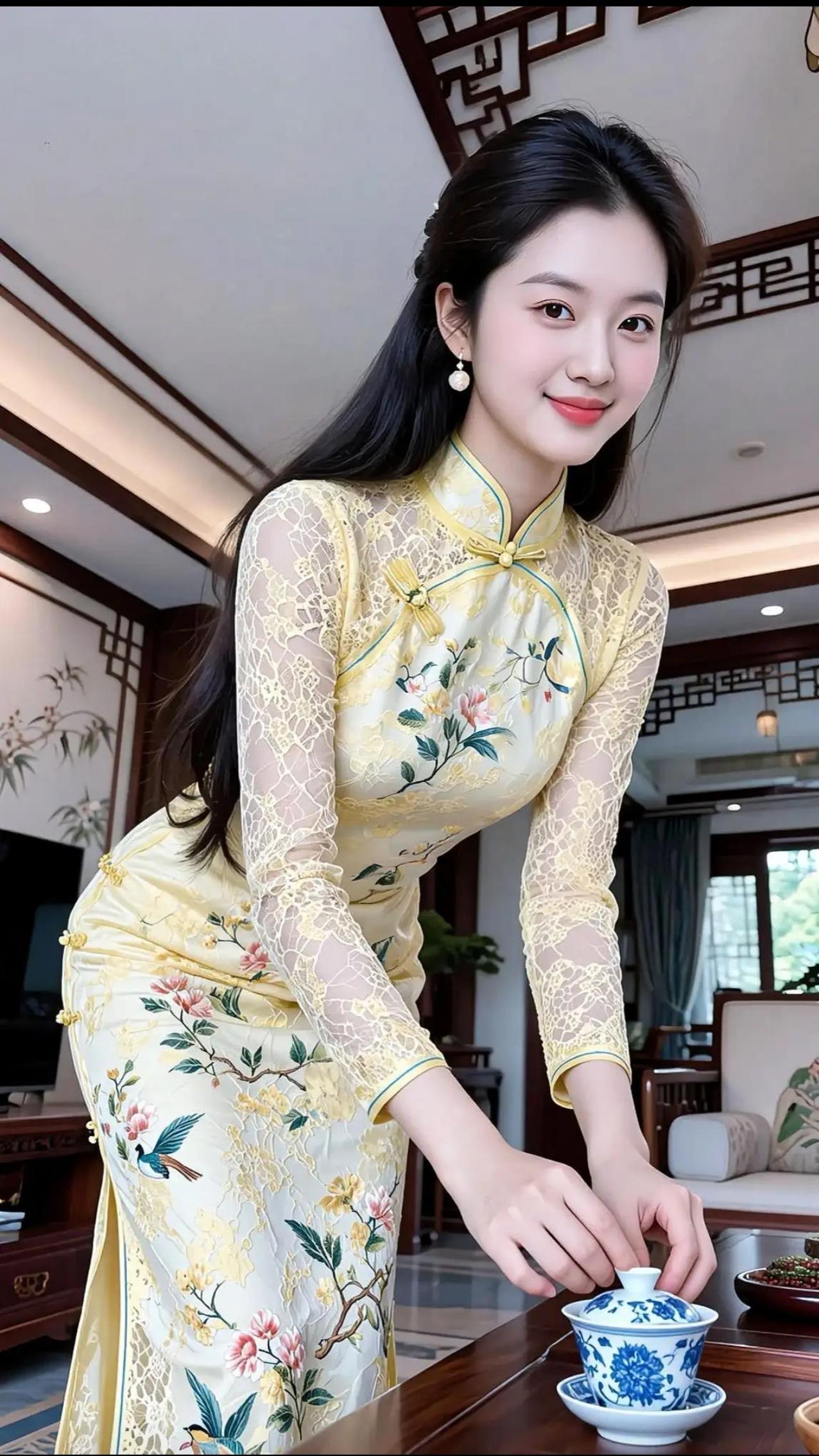 这组照片展现了一位年轻女性在不同场景中演绎新中式旗袍美学的系列写真。她身着多款设计精巧的旗袍——从淡蓝刺绣、鹅黄蕾丝到粉紫晕染、正红提花,每一套都融合传统纹样与现代剪裁,搭配珍珠、玉镯、发簪等配饰,尽显东方女性的温婉与雅致。 背景涵盖茶室、庭院、花墙与古典窗棂,光影柔和,氛围静谧。她或执扇轻倚,或执壶斟茶,或持花浅笑,姿态从容,眼神含情,仿佛将“旗袍是流动的诗,女子是静止的画”这一意境具象化。整体画面不仅呈现服饰之美,更传递出一种“慢生活、重仪式”的东方生活哲学。