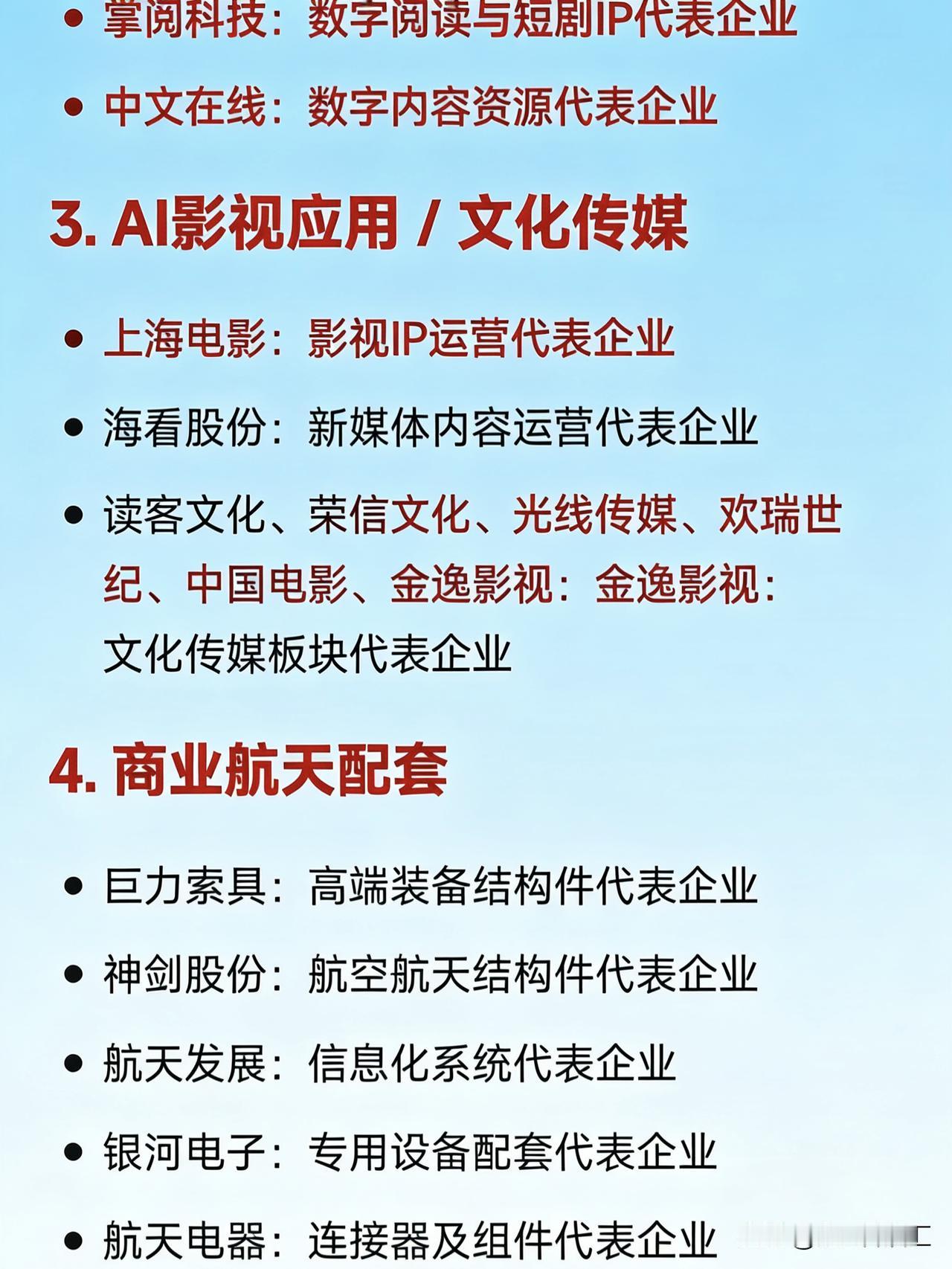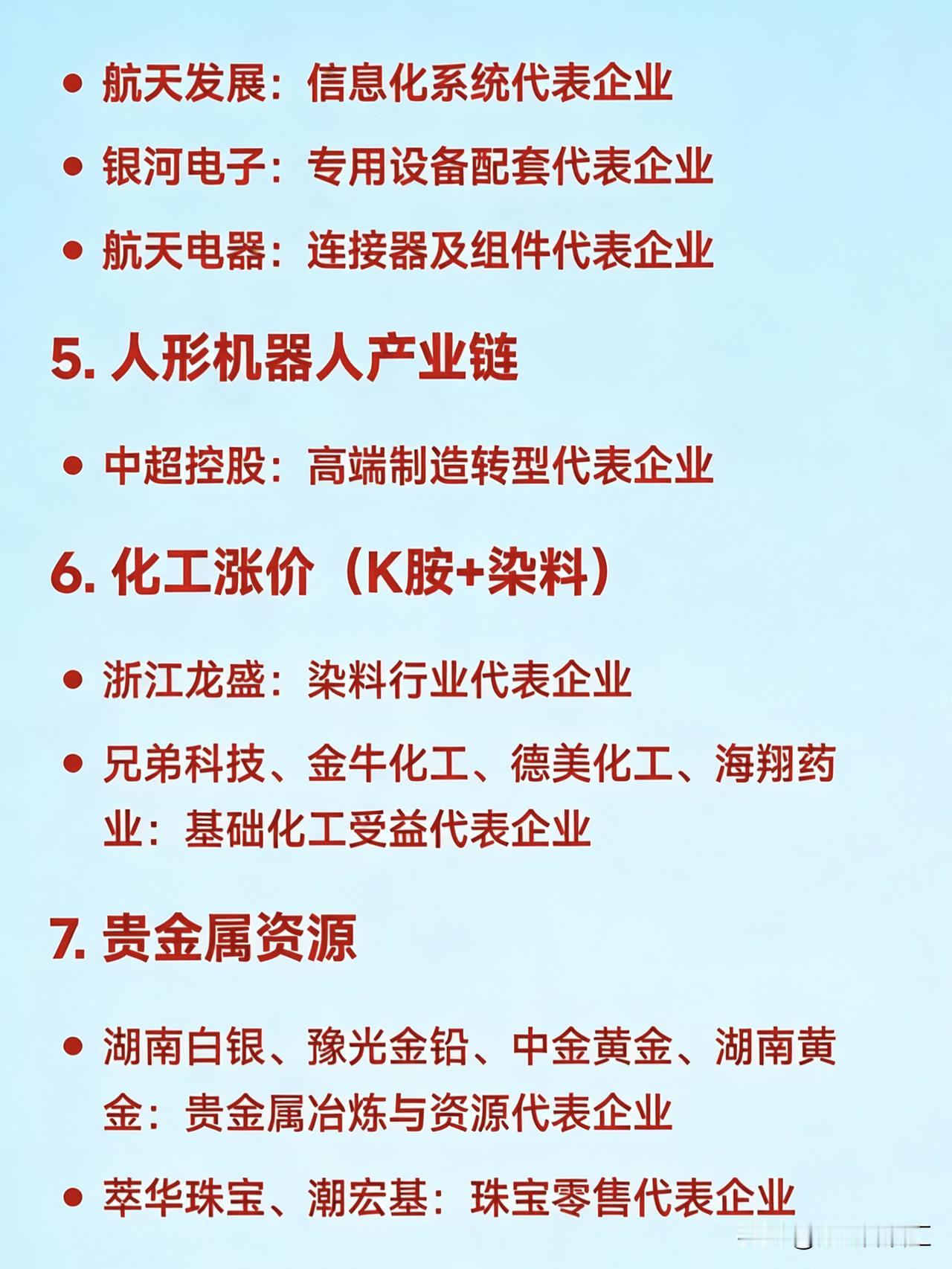 2026年2月10日十大热点科技及其产业链核心龙头 1. 高效光伏 协鑫集成:钙钛矿叠层电池技术代表企业 TCL中环:高效光伏材料代表企业 拓日新能:HJT与钙钛矿电池代表企业 亚玛顿:光伏玻璃+组件代表企业 爱旭股份:高效电池一体化代表企业 2. AI视频生成 / 多模态内容 捷成股份:AI内容生成代表企业 三六零:AI应用代表企业 掌阅科技:数字阅读与短剧IP代表企业 中文在线:数字内容资源代表企业 3. AI影视应用 / 文化传媒 上海电影:影视IP运营代表企业 海看股份:新媒体内容运营代表企业 读客文化、荣信文化、光线传媒、欢瑞世纪、中国电影、金逸影视:文化传媒板块代表企业 4. 商业航天配套 巨力索具:高端装备结构件代表企业 神剑股份:航空航天结构件代表企业 航天发展:信息化系统代表企业 银河电子:专用设备配套代表企业 航天电器:连接器及组件代表企业 5. 人形机器人产业链 中超控股:高端制造转型代表企业 6. 化工涨价(K胺+染料) 浙江龙盛:染料行业代表企业 兄弟科技、金牛化工、德美化工、海翔药业:基础化工受益代表企业 7. 贵金属资源 湖南白银、豫光金铅、中金黄金、湖南黄金:贵金属冶炼与资源代表企业 萃华珠宝、潮宏基:珠宝零售代表企业 8. 先进封装 / 存储配套 长电科技、华天科技:封装服务代表企业 太极实业、大港股份:存储产业链配套代表企业 9. 光通信 / 新一代通信材料 天孚通信:光器件核心部件代表企业 长飞光纤、杭电股份:光纤与特种缆线代表企业 10. 新型电池材料 / 电池回收 杉杉股份:电池材料与循环利用代表企业 永太科技:氟系功能材料代表企业