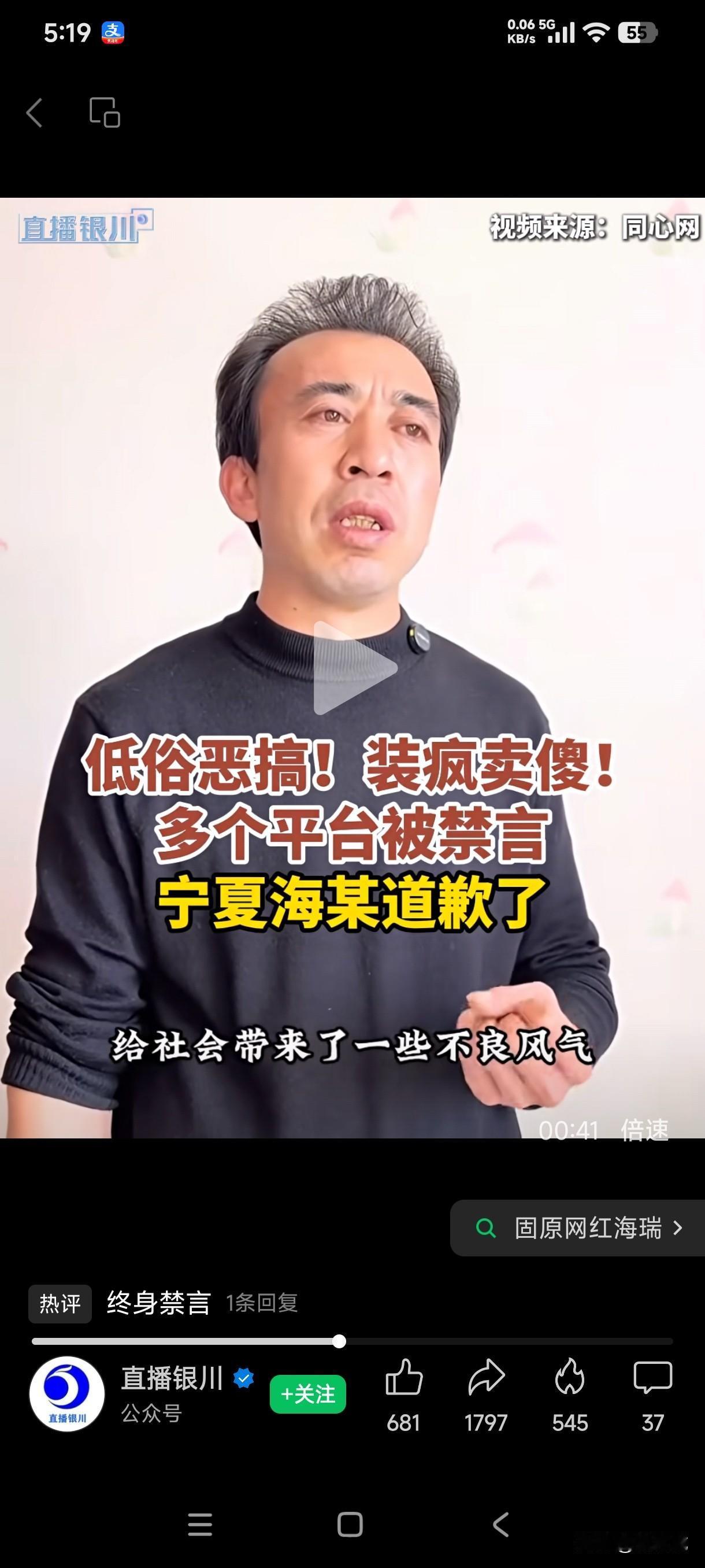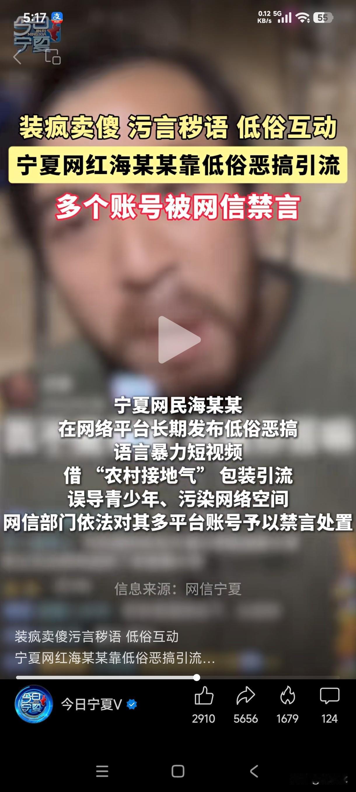 宁夏亏达(爸)网红主播海瑞以装疯卖傻,污言秽语,低俗互动误导青少年,污染网络环境的行为被网信部门约谈,多个平台账号被予以禁言处置。 这宁夏最大的亏爹主播没想到也有今天,多少网友对他恨之入骨,他装疯卖傻污言秽语的行为带坏了网络风气,误导了青少年的身心健康,他在直播间对那些粉丝一口一个爹,一口一个妈,让那些老六冤大头给他刷礼物,网信部门对他的禁言可谓是大快人心,甚至有网友建议给他终身禁言,永久封禁才解气,他就像瘟神一样惹得众人不满,这次对于他多个平台账号的禁言让网友拍手叫好,像这种带坏社会风气,污染网络空间的低俗恶搞主播,应该给永久终身封禁才解气。宁夏海瑞 固原海瑞 海瑞模仿 海瑞模仿秀