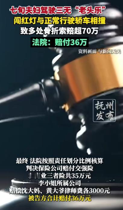 七旬夫妇驾驶三无“老头乐”闯红灯与正常行驶轿车相撞致多处骨折,起诉轿车女司机索赔超70万!法院:赔付36万!女司机:闯红灯的是他们,我也受伤了,赔钱的怎么还是我?难道谁弱谁有理? 平时人们出门上下班、买菜遛弯,在城市的大街小巷里,总能见到那种不用考驾照、不用上牌照、也不用买保险的四轮小型电动车,大家习惯性把这类车叫作 “老头乐”。 因为上手简单、不用繁琐手续,很多上了年纪的居民都把它当成日常代步的首选,可这份看似省心的出行方式,背后藏着的安全风险,却常常被大家忽略。 上海某街道,路口的交通信号灯正常运转,女司机李锦(化名)沿着绿灯指示正常直行,全程保持合规车速,没有任何违规操作。 年逾七旬的沈大妈握着方向盘,驾驶着一辆无牌照、无行驶证、无保险的三无老头乐,车上还载着自己的丈夫黄大爷,行至路口时,沈大妈完全没有理会亮起的红灯,径直朝着马路对面冲去。 李锦视线里突然出现这辆代步车时,两车已经近在咫尺,她来不及做出任何避让动作,两车就发生了猛烈碰撞。老头乐的车身材质单薄,没有任何安全防护结构,受到撞击后瞬间变形。 车上的两位老人因剧烈冲击导致身体多处骨折,伤势较重,被紧急送往医院救治,李锦也在碰撞中受到损伤,驾驶的轿车车头凹陷、部件损坏,原本普通的出行,被这场突如其来的事故彻底打乱。 经过一段时间的住院治疗,两位老人的伤情逐渐稳定,可治疗过程中产生的医疗费、护理费、康复费等各项开支,成了一笔不小的负担。 老人家属梳理完所有费用后,认为李锦作为轿车驾驶人,应当对事故承担赔偿责任,随后便将其告上了法庭,要求赔偿70万元。 这笔索赔诉求传到李锦耳中时,她只觉得难以接受,反复回看事发监控的她十分确定,自己全程遵守交通规则,事故的直接原因是对方驾驶违规车辆闯红灯,自己同样是事故的受害者。 不仅身体受伤,车辆也遭受损失,如今却要承担高额赔偿,她始终想不明白,守规矩正常行驶的人,为何要为他人的违规行为买单。 法院受理案件后,对事故进行了全面核查,交警部门经过专业勘察后认定,沈大妈驾驶禁止上路的三无车辆,且存在闯红灯的严重交通违法行为,对事故发生负百分之五十的主要责任。 而李锦在绿灯通行时,未做到最大限度的观察瞭望,承担百分之三十三点三的次要责任,最终法院判决李锦赔付36万元。 近段时间,全国多个城市都在开展三无老头乐的专项整治工作,这类车辆引发的交通事故一直居高不下。 驾驶老头乐的群体大多未接受过正规驾驶培训,对交通信号灯、通行规则的认知较为薄弱,闯红灯、逆行、随意占用机动车道、突然变道等违法行为十分常见,给正常的道路通行秩序带来极大干扰。 不少老年人选择购买老头乐,是被商家宣传的 “无需手续、操作简单、遮风挡雨” 吸引,却忽略了车辆本身的安全缺陷。 也不清楚驾驶三无车辆上路属于违法行为,等到事故发生,才明白看似便捷的代步工具,实则藏着危及人身安全的巨大风险。 道路通行的规则,是保障所有人安全的底线,不管是驾驶正规机动车,还是使用各类代步工具,遵守信号灯、不违规上路、不随意变道,都是对自己和他人生命安全的负责。 法律的判定从来不是以伤情轻重为标准,而是以事故过错为依据,只有每一位交通参与者都敬畏规则、遵守法律,才能让日常出行变得更加安全稳妥。 对于这件事,您有什么想说的吗?欢迎评论区留言讨论。 信源:抚州发布2026-02-02——《七旬夫妇驾驶三无“老头乐”,闯红灯与正常行驶轿车相撞,致多处骨折索赔超70万,法院:赔付36万》