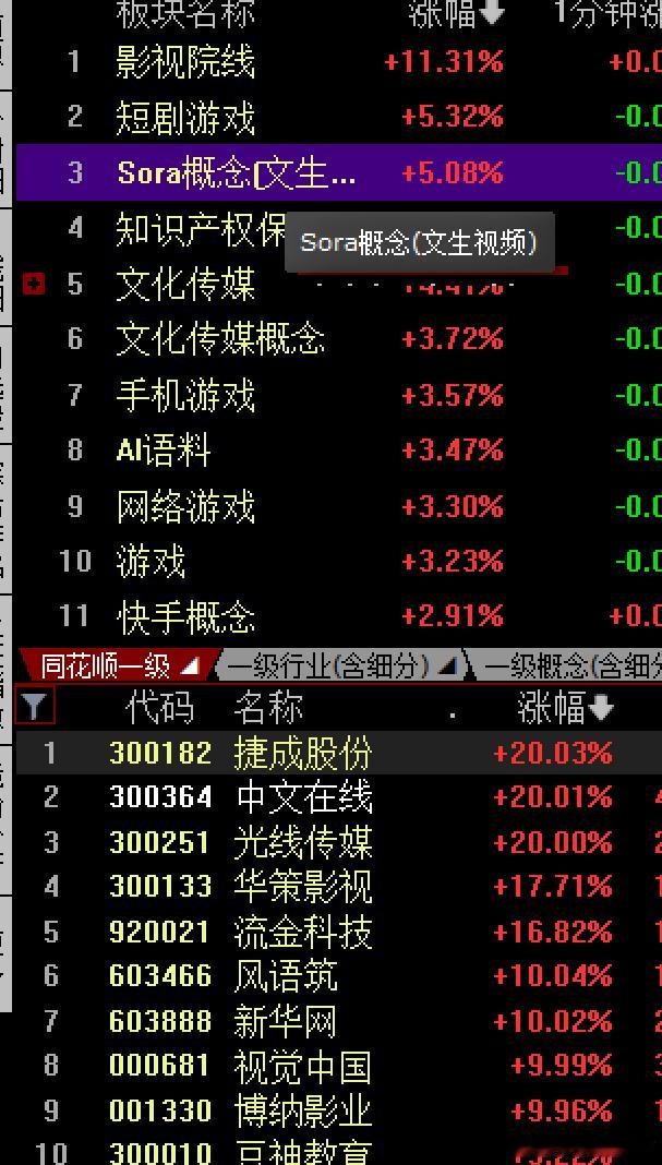 眼下市场一大问题就是热点板块轮动太快,昨天的商业航天光伏概念等一日游,下去了,相对好点是AI应用端,受到春晚催化,传媒游戏文化传媒,文生视频概念等AI应用端,相对活跃,中文在线捷成股份连续两根大长腿20CM,欢瑞世纪,奥飞娱乐,光线传媒视觉中国横店影视等股上涨,也是今天唯一算坚挺住的概念板块,不过小高潮到了明天也要分化了别追高了去年过年deepseek概念,机器人火爆,今年会是哪个呢AI应用端的爆发,涨9%以上逾20家,也催化了大数据,数据确权,知识产权,信创概念,云计算,国资云,多模态AI小红书概念等但也少不了半导体存储芯片,算力概念,元件等需求端的激增,只是冲高回落,中富电路,芯源,海光,,晶方,晶合集成及东芯等,大方向逻辑不要偏离,等板块轮动风口吹来cpo光模块,pCB概念也是少不了午后人形机器人减速器,拉了一把,但多数冲高回落,仅有万向钱潮,长飞光纤等守住涨停,兆威机电五洲新春,模塑,东方国信等股跟涨在量能萎缩明显下,一天轮动拉了那么多板块,明显动力不足的,这种行情别追涨追高,看好的主要矛盾核心,回踩低吸是机会节前昨天的商业航天光伏一日游,顺灏跌停大消费板块越靠近春节,越弱,容易“见光死”杭州解百跌停