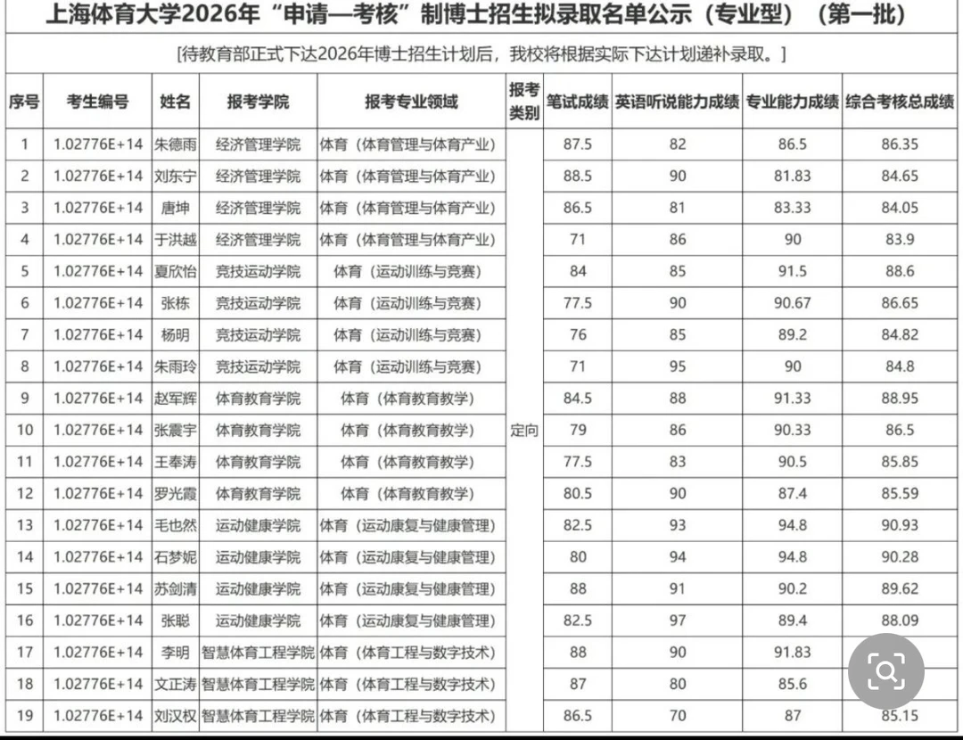 上海体育大学2026年“申请-考核”制博士招生拟录取名单