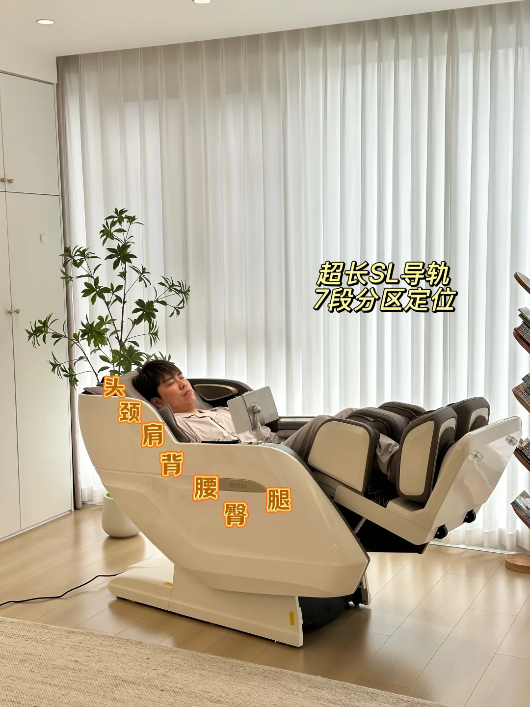 爸妈年纪大了腰椎不好,晚上就想找个舒服的地方躺一躺,深深躺进按摩舱里,1431mm超长SL导轨完美贴合肩颈到腰背,托住一天的劳累。七段式分区都能无缝隙贴合,从头开始,往下到颈部,肩膀,再到后背,一直能照顾到腰,臀,连腿都能全包住--整整7个部位。最值得一提的是大部分按摩椅按不到头,荣泰A52Max却能兼顾到,回家一躺上,一整天的疲惫都烟消云散了~