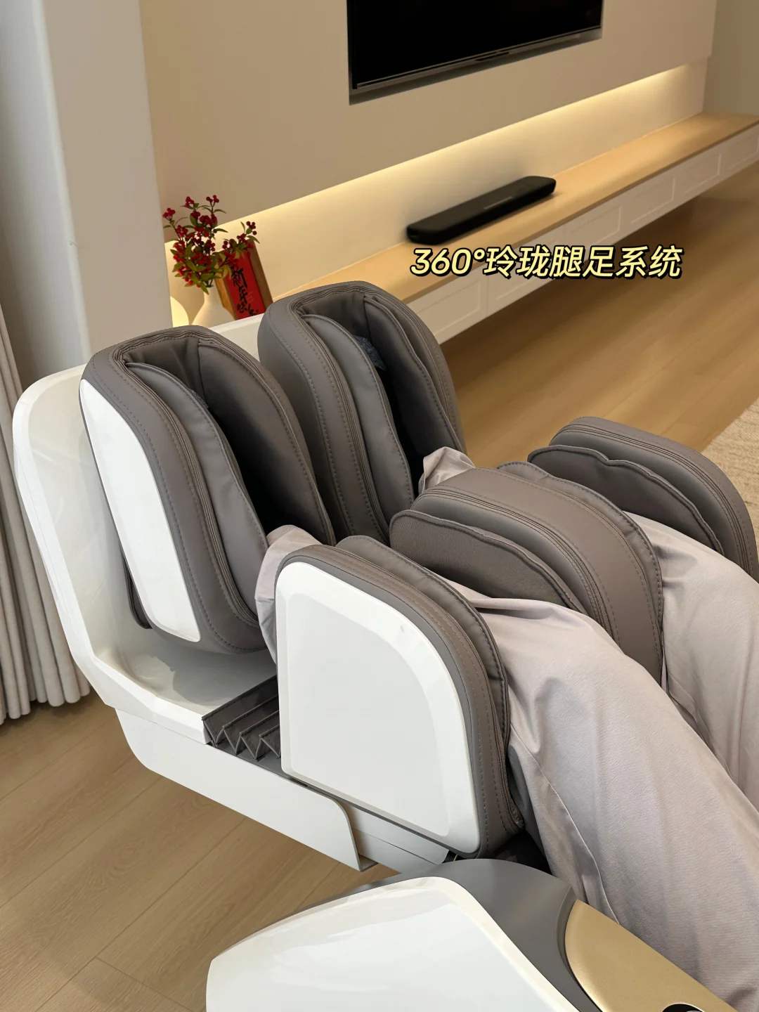 之前和爸妈逛商场的时候也试过一体式的按摩椅,不但脚踝按不到,小腿按压也不得劲,这款按摩椅独有的360º玲珑腿足系统,脚踝能360°摇摆扭动,像按摩师傅一样把僵硬的地方慢慢松开,帮你充分拉伸脚踝韧带,脚背两侧气囊稳稳包裹住,脚底还有刮痧轮,按的时候连带着小腿、脚踝一起放松,奔波一天回来按摩十分钟缓解疲劳~