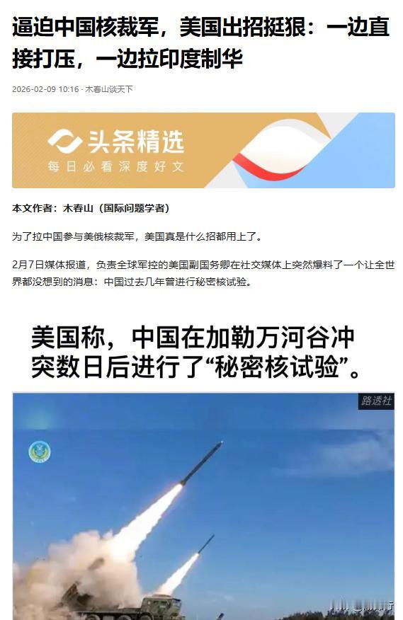 美国甩出 6 年前假料碰瓷中国,核裁军牌打得太没底线 美国为了拉中国进核裁军谈判,真是连基本的逻辑和脸面都不要了。 前脚美俄《新削减战略武器条约》刚到期,后脚美国副国务卿就跳出来爆料,说中国 6 年前在南疆搞了秘密核试验,还号称用了先进技术隐藏踪迹。 这波操作看得人一脸懵,6 年前的事现在翻出来,既没实锤又被国际组织当场打脸,明摆着就是故意栽赃,为的就是给中国扣上 “核威胁” 的帽子,逼我们接受不平等的核裁军条件。 说起来这事离谱到了极点。美国口口声声说 2020 年 6 月中国搞了秘密核试验,可当时半个字不提,偏偏等美俄核条约失效、要谈新框架的时候才放风,这针对性简直写在脸上。 更可笑的是,它说中国用技术掩盖了地震波,可全面禁止核试验条约组织的监测系统,在所谓的时间段里根本没检测到任何中国核活动,连距离最近的印度都毫无反应,远在天边的美国却号称 “发现了”,这不是空口说白话是什么? 明眼人都看得出来,美国这招就是典型的 “甩锅式碰瓷”。美俄各自攥着五千多枚核弹头,中国核弹头数量不过六百枚左右,连他们的十分之一都不到。 这些年美国一边斥资四百多亿美元升级核弹头,一边退出《中导条约》《开放天空条约》,不断突破核军控底线;俄罗斯也因美国的敌意暂停履行核条约义务。 美俄自己把核军控的规矩搅得天翻地覆,如今条约失效了,不想着自己解决问题,反倒把锅甩给中国,说中国核武库增长是 “绊脚石”,这双标玩得也太溜了。 美国的算盘打得噼啪响:只要给中国扣上 “秘密核试验” 的帽子,就能把核裁军的焦点转移到中国身上,逼着中国加入美俄主导的三方谈判,用不平等的条约锁死中国的核力量发展。 要知道,中国的核力量发展本就是补短板,从 240 枚到 600 枚的增长,不过是完成了三位一体核威慑的基础建设,连美国智库认定的最低理论值都没达到。而美俄早就拥有成熟的核威慑体系,却还想着限制中国的正当国防权利,这根本就是霸权主义的逻辑。 更让人不齿的是,美国为了给中国施压,还特意拉上印度煽风点火。 故意把所谓的 “核试验时间” 和加勒万河谷争端绑在一起,跟印度说中国在边境附近搞核试验,给印度制造安全焦虑。 果然印度国内一些势力被带偏了节奏,开始指责中国,甚至喊着要扩充核武库。美国这招既想挑拨中印关系,又想借印度的声音形成对中国的舆论包围,用心极其险恶。 可美国再怎么炒作,也改变不了几个基本事实:中国始终恪守不首先使用核武器的承诺,这是美俄都做不到的; 中国的核武库规模与美俄天差地别,核裁军的首要责任本就该由美俄承担;国际组织的监测结果已经戳穿了美国的谎言,所谓的 “秘密核试验” 根本就是无稽之谈。 中国早就表态,愿意在五核国框架下开展军控对话,但坚决反对美俄把中国当作甩锅对象,用虚假议题逼迫中国接受不合理条件。 美国别以为靠造谣抹黑就能让中国妥协,中国早已不是任人拿捏的国家。 核军控的正道,是美俄率先履行核裁军的特殊责任,大幅削减核武库,而不是把矛头对准中国。美国如果真的在乎全球核安全,就别再玩这些阴招,拿出点诚意来解决自己的核军控问题。