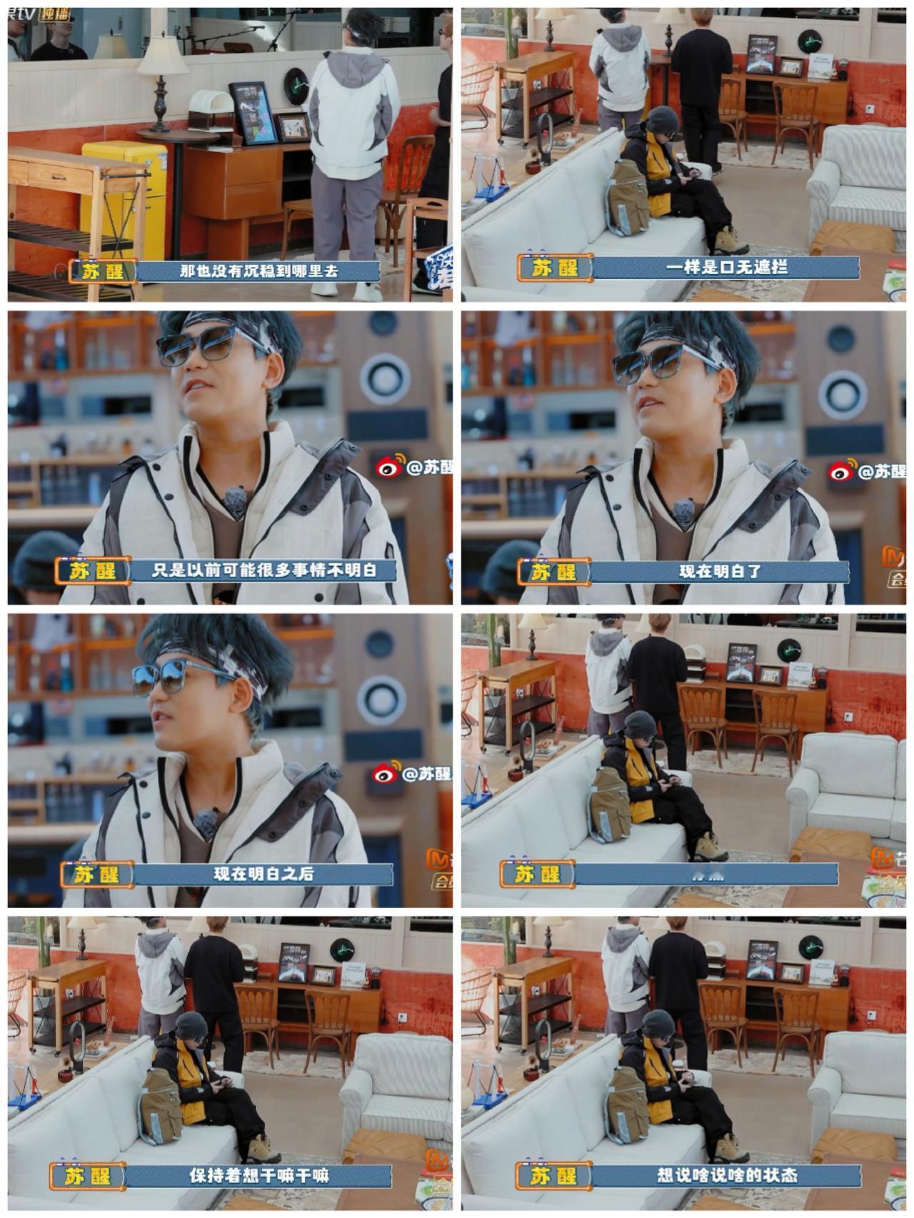 李昊本想夸奖苏醒, 想不到苏醒会 做出这样的回应。 苏醒看着以往的照片, 感慨万千。 旁边的李昊赞叹苏醒比以前 沉稳了许多。 在李昊的印象中, 苏醒以前参赛时是洒脱不羁。 一般人就这样把这个评价 哈哈接下来, 敷衍过去了。 但是苏醒却认真起来。 苏醒强调自己还是那么不羁, 照样口无遮拦, 没有沉稳多少。 苏醒坦言自己以前很多事情不明白, 当下明白了, 依然我行我素, 没有一丝掩盖自己的本意。 关键是自己开心就好。 哎呀, 如果换作他人, 那么多年过去了, 早就被岁月磨去了棱角, 只剩下残破不堪的自己。 而苏醒偏不, 当他看清周遭世界的本色后, 明明知道自己的棱角会划伤自己, 但是他依然选择保持自己的“棱角”, 不去迎合这个世界的喜好, 即使会使自己遍体鳞伤。