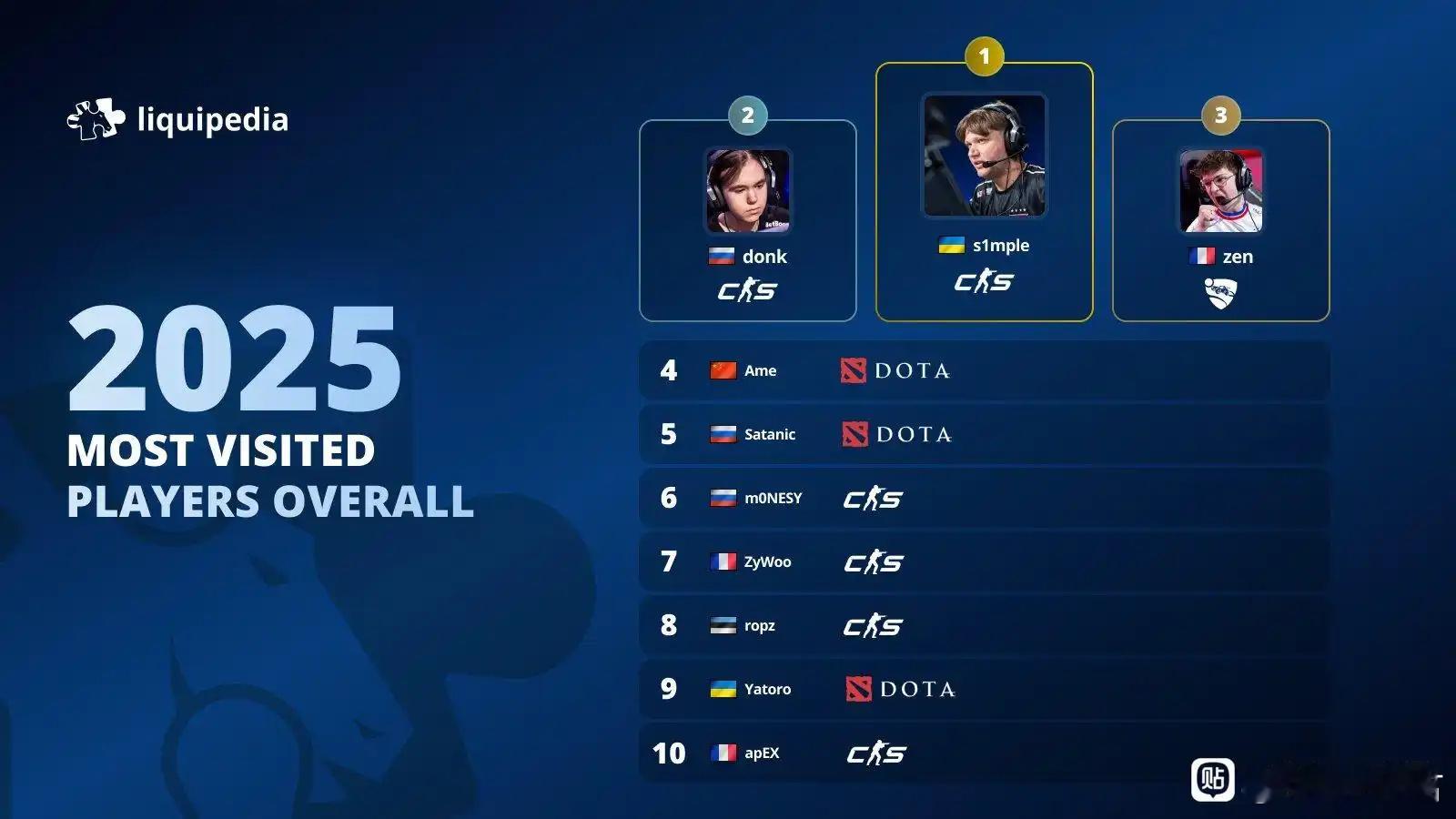 液体百科2025浏览量前10的选手,CS的s1mple位列第一,Ame位列第四,小孩哥第五,Yatoro第九,DOTA2上榜的都是一号位啊cs2dota2