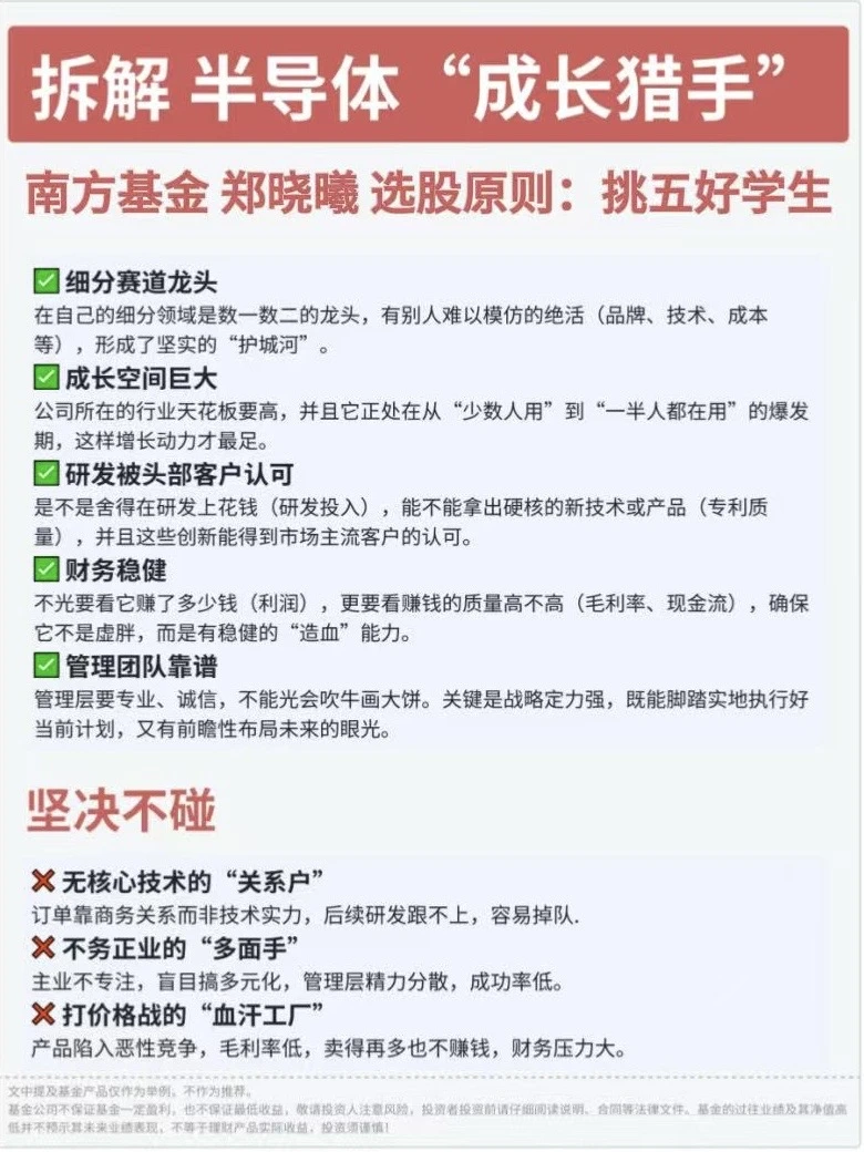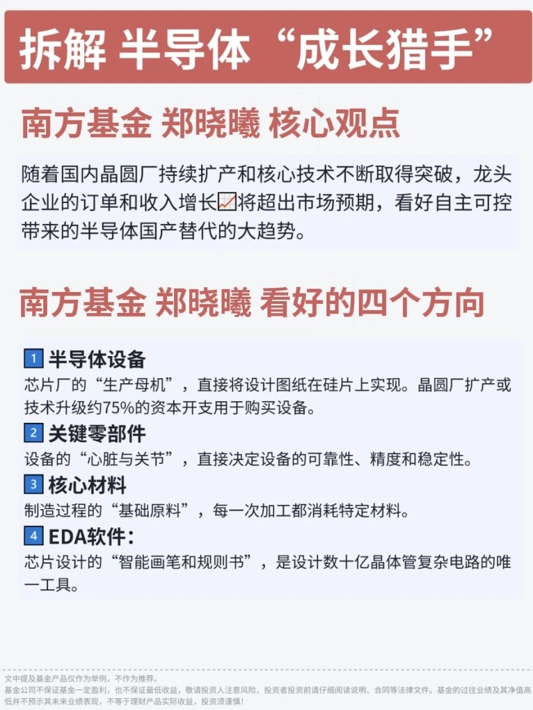 专业的事交给专业的人来做,我关注的南方郑晓曦,她有一条明确的投资主线,就是专注半导体产业链的自主可控与景气周期投资。