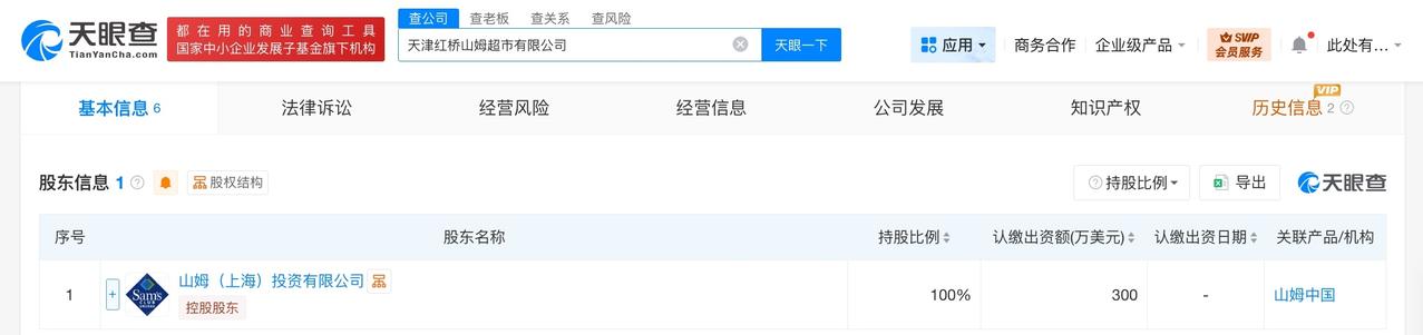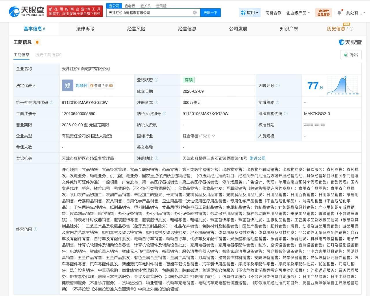 山姆超市在天津红桥成立新公司注册资本300万美元 天眼查工商信息显示,近日,天津红桥山姆超市有限公司成立,法定代表人为郑硕怀,注册资本300万美元,经营范围含食品销售、食品经营管理、食品互联网销售、药品零售、出版物互联网销售、出版物批发、餐饮服务、国内贸易代理等。股东信息显示,该公司由山姆(上海)投资有限公司全资持股。 天眼查信息: