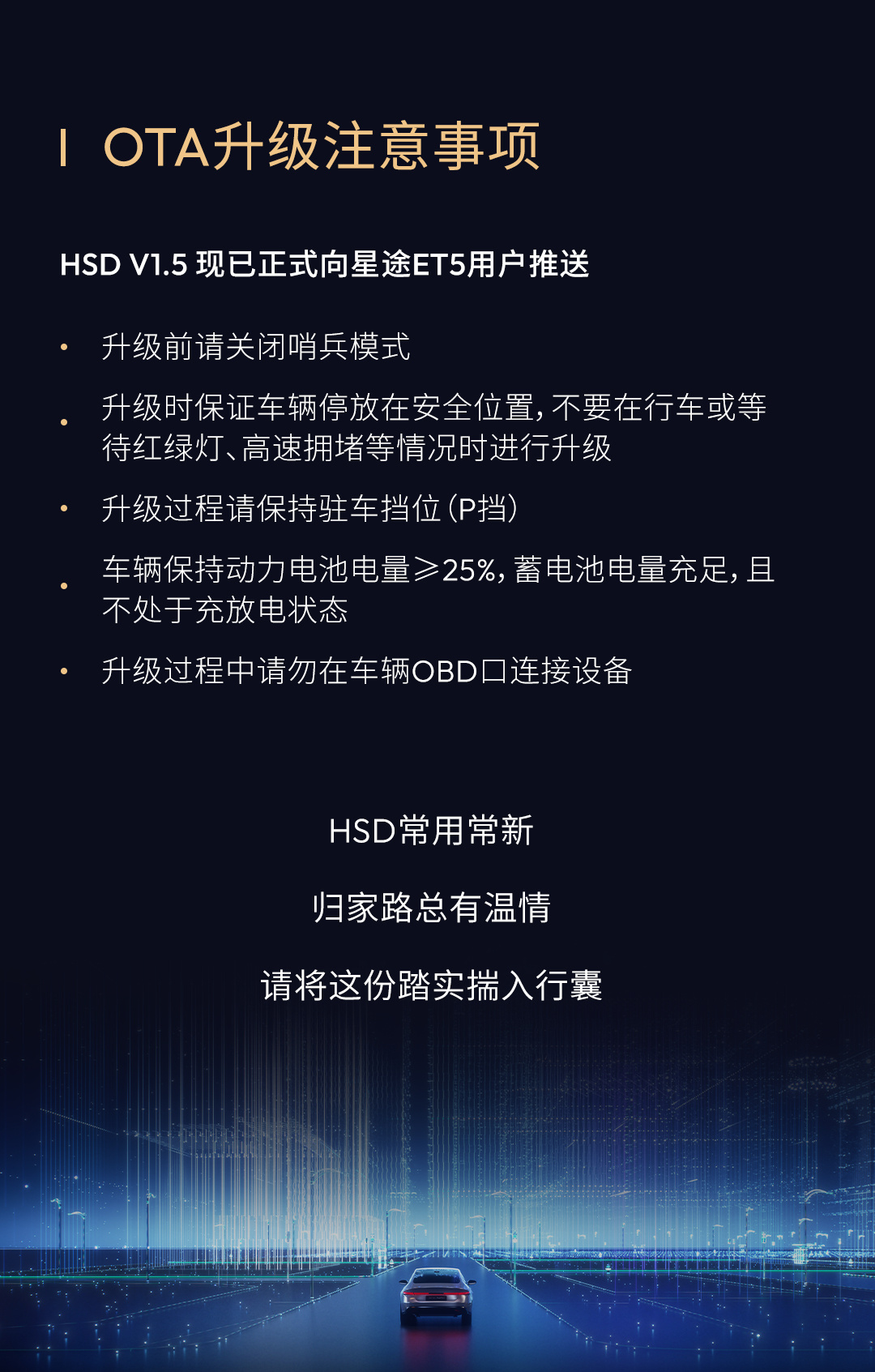 HSD V1.5版本已经对星途ET5用户开启推送地平线HSD首次OTA开启地平线HSDV1.5开启推送智驾返乡排面拉满