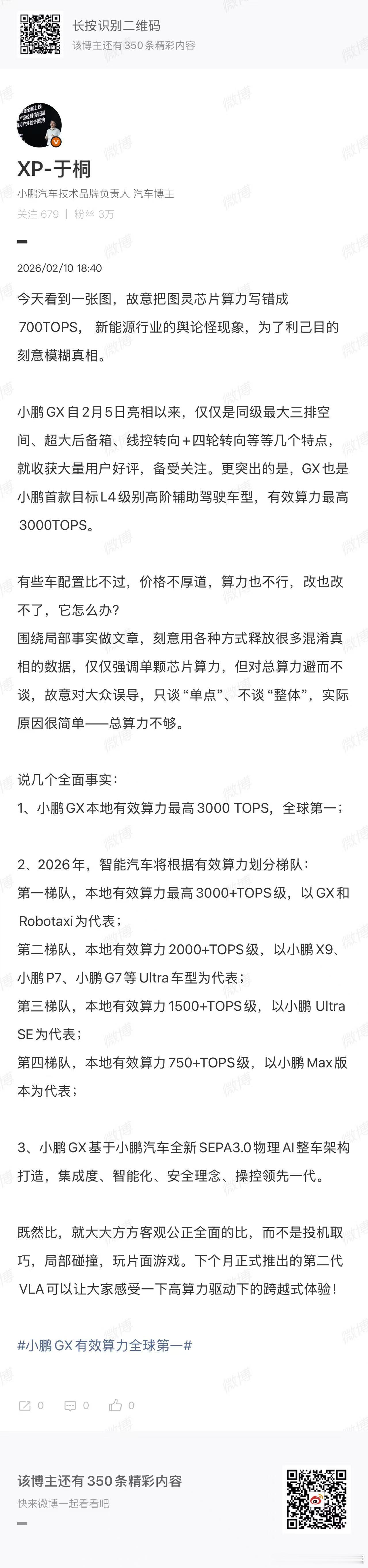 辅助驾驶的好坏,不单是取决于“软硬协同”与复杂路况下的决策能力,最重要的还是看体验小鹏目前已经实现了从芯片到架构的完整闭环第二代VLA即将到来,实力绝非纸上谈兵。真正的技术平权,是让用户开上、用上,而非停留在PPT。 ps: 下个月应该就能体验上了 小鹏GX小鹏GX有效算力全球第一