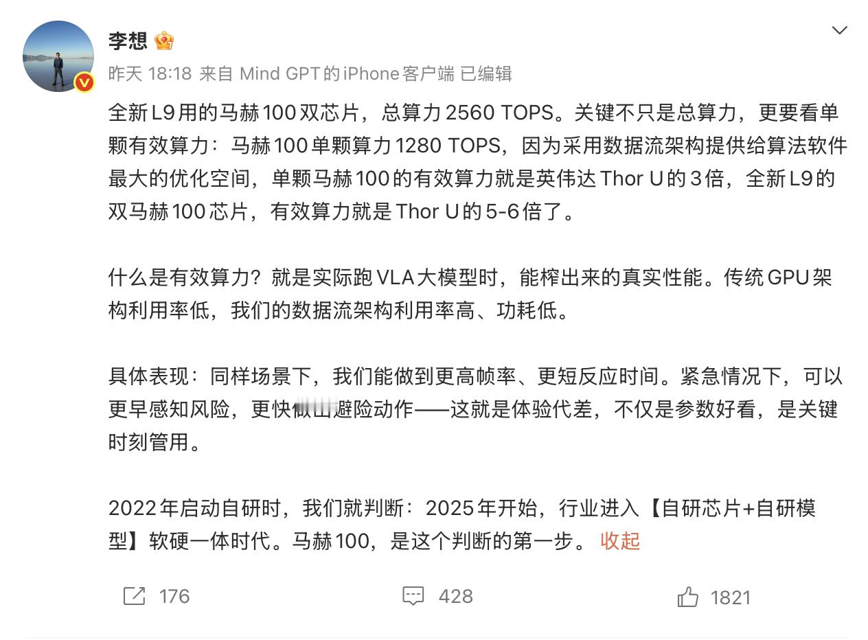 李想昨天微博公布了理想汽车传说已久的自研芯片,命名为马赫100。有效算力据称是Thor U的5-6倍。