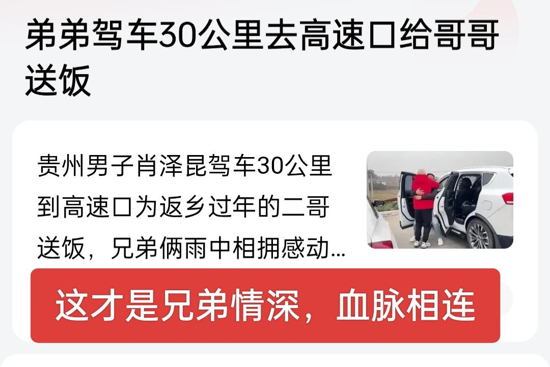 弟弟驾车30公里给哥哥送饭,这才是兄弟情深,血脉相连,和昨天刷到的那个弟简直是天渊之别!哥哥住弟弟家睡沙发还不给被子,还要用几张纸垫脚上,以免弄脏小孩玩具,不敢想象还有这样的兄弟! 今天的弟弟就很值得点赞,弟媳妇儿也一定是个好相处之人,这才是中国传统文化孕育的家庭,满满的全是亲情!