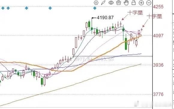 第一,今天三市的成交额进一步的萎缩,缩量1400多亿。与此同时,对应的是标准的窄幅波动十字星。缩量十字星,非常经典的短线上涨动能衰减的信号。我们看到上一次市场在出现较大幅度调整之前,也是出现了标准的十字星。大家请看下图一上证指数日线图。