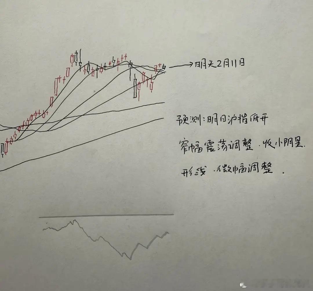第三,从今天市场的走势来看,上证指数,日线级别已经走出了六连阳的走势。从概率的角度来讲,六连阳的情况下,下一个交易日收阴线的概率较大。这个地方不得不说一句的是,当前市场的行情确实有其比较独特的地方,比如说前面上证指数非常任性的走出了17连阳的走势。不过莎哥认为虽然有前面这样一个近在咫尺的强势走势的例子 ,但是在接下来的走势考虑当中,我还是会优先考虑到概率的问题。所以综合以上分析,我对于明天上证指数的走势,莎哥认为明天市场震荡,调整的概率相对偏大。那么明天A股到底怎么走?大家请看图三关于明天走势的手绘预测图: