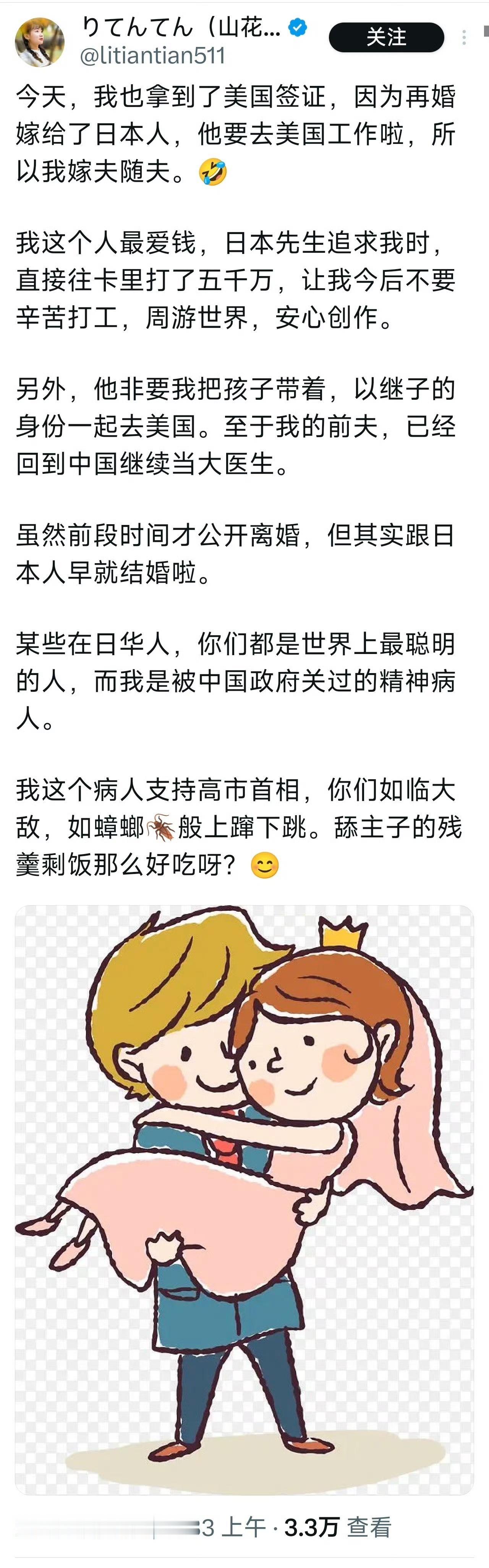 曾经的中国女教师李田田,近日在网上高调秀恩爱,她发文说,前夫已经回中国了,现在嫁了个日本人,日本丈夫要去美国工作,她也跟着顺利拿到美国签证,而且日本丈夫在追求她时还给了她5000万…. 故事臆想的不错,像她这样的人要是真有她说的那些东西,早就截图9张写一大篇小作文来炫耀了…