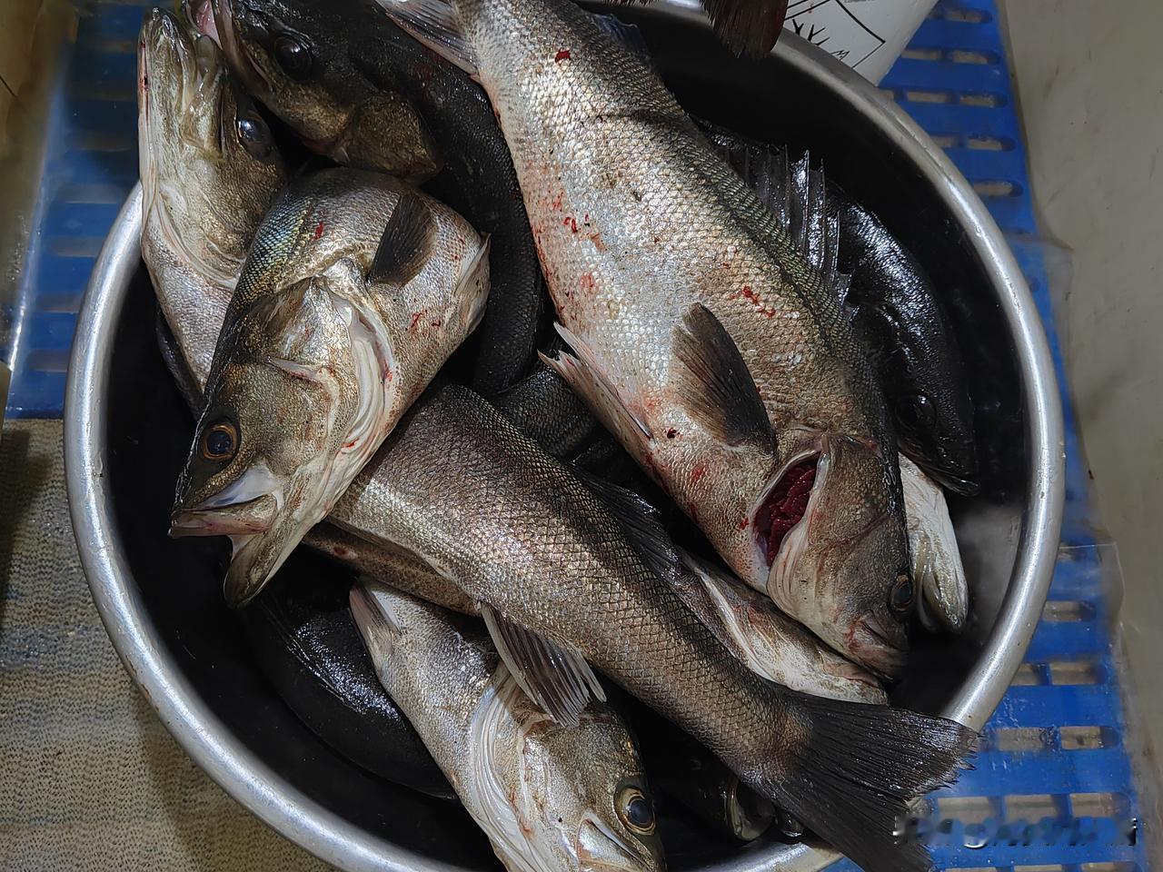9点钟的时候,正在手机上学习**,听到有人在敲门,于是我赶紧穿好衣服,把手机音量关小,过去开门,门开了,是昨天晚上钓鱼的水手,他说:“我听到你屋里有讲**的声音”,我说我在学习啊! 他说钓了很多鱼,让我把库房门开一下,我问他,钓了多少,他说钓了很多,你去看一下,本来不想下去的,无奈他非得让我下去看看,我换上鞋子,去了库房,刚走到菜库门口,两桶一盆海鲈鱼在菜库门口放着,我问钓了这么多,你们三个人钓的?他说四个,我说还有老轨吧!他说是的。 这么多鱼估计得有70多斤,30多条吧!昨晚两个人钓了一桶都钓了9条,今晚四个人钓了两桶一盆,30条应该没问题吧,哈哈,这么多鲈鱼,吃一个航次没问题了!