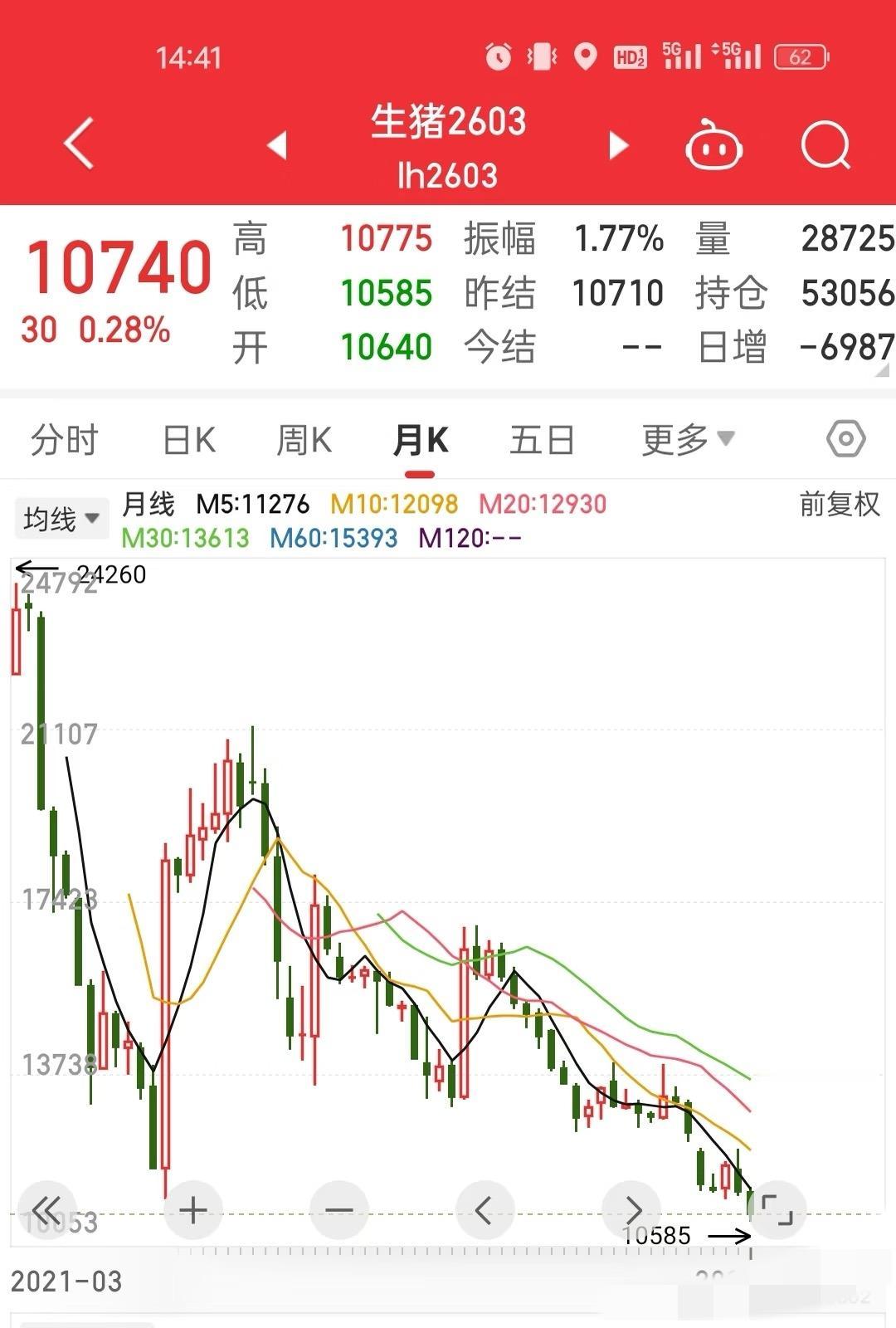 猪肉五块钱一斤了,该反弹了吧? 3月份的猪价, 已经跌到了10740一吨, 算下来一斤猪肉五块四毛。。。 已经是最近五六年的最低价了, 养猪场都要亏吐血了, 该反转了吧!