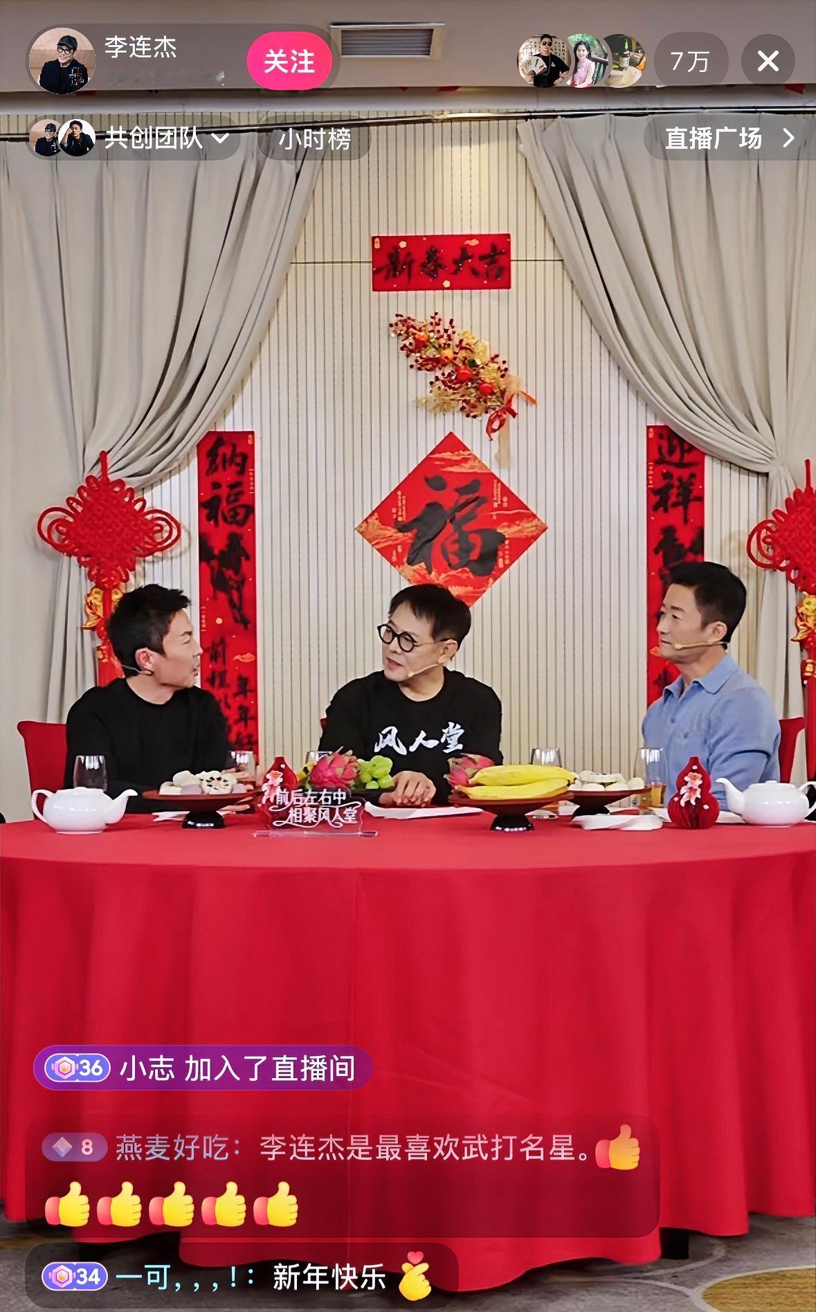 今晚功夫打星三巨头,吴京谢苗做客李连杰直播间,三人谈过去拍戏故事。 三人都是影视界中功夫打星,《少林寺》让李连杰从武术冠军变成功夫打星,吴京《战狼2》热度不断,谢苗因与李连杰演父子出名。 时隔15年李连杰重返武侠片,李连杰与吴京同是北京武术同门师兄,两人合作的电影《镖人:风起大漠》在今年大年初一上映。
