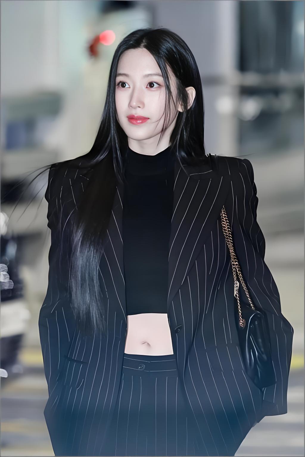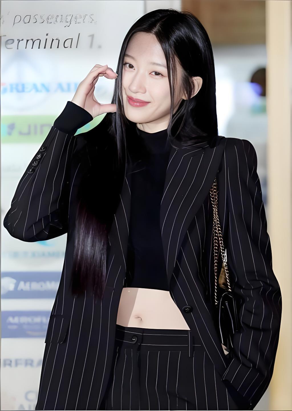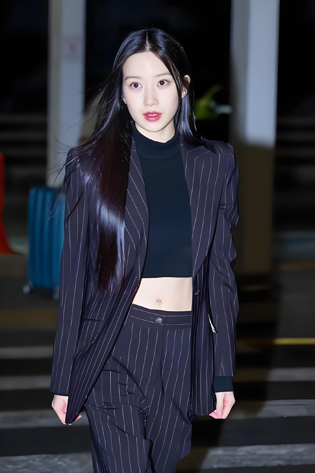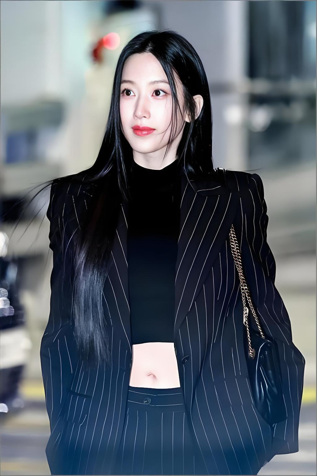 韩国美女模特文佳焕搭配黑色条纹西装,尽显魅力女神风范。