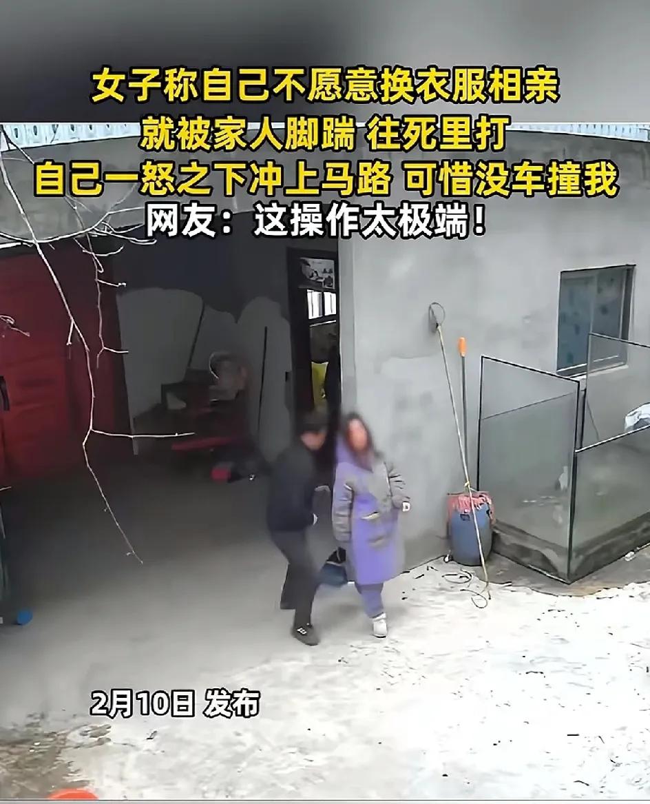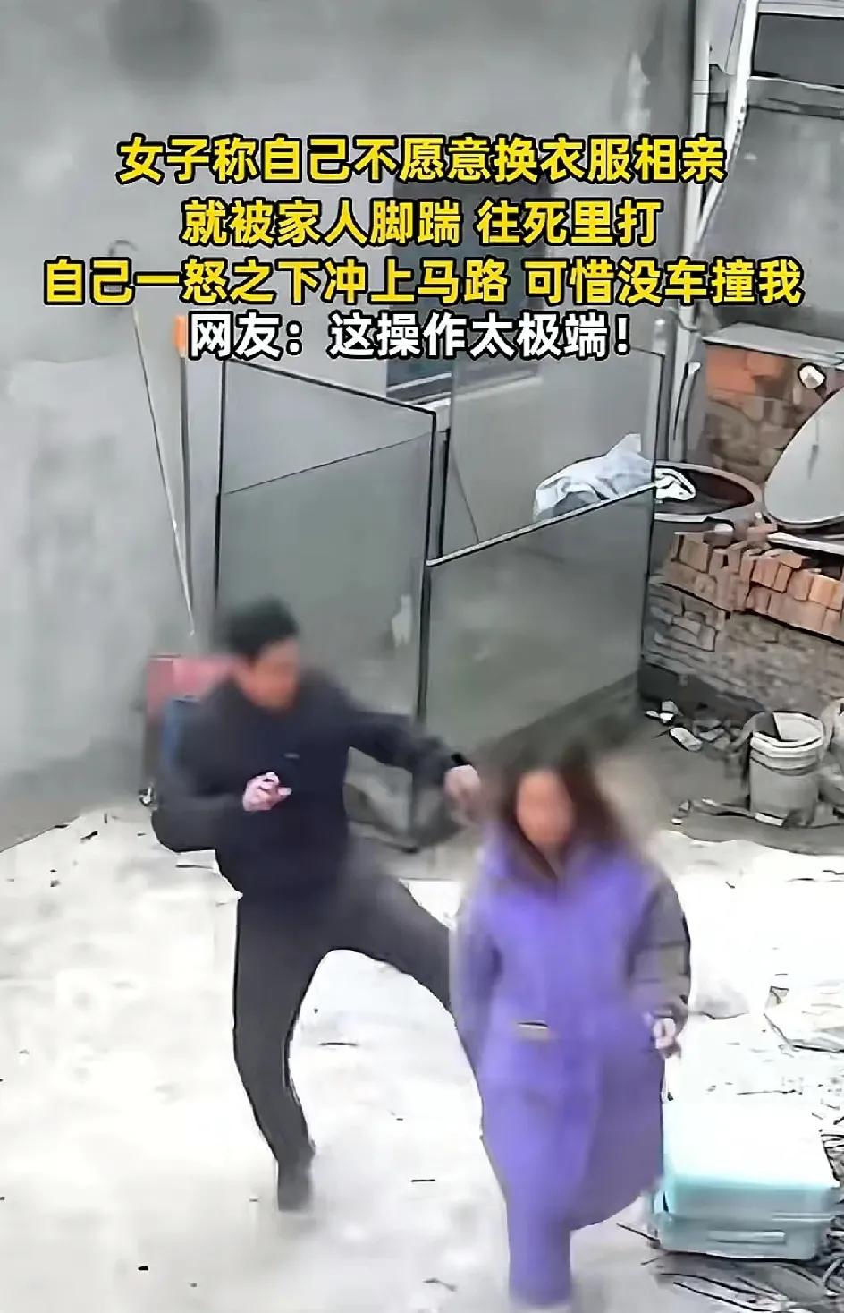 一女子过年在家,只因为自己不愿意换衣服相亲,被父亲用脚踹。踢了好几脚,往死里打。她伤心欲绝,冲上马路。她说,不想活了,可惜没有车撞我。 有的网友说:家长这样做太极端了。 有的网友说:女大不中留,留来留去留成仇。如果不上班的话,在家里靠父母养着,养了二三十年了,确实会发火。 不结婚是自由,但一定要自立。大不了搬出去,自己一个人住。如果大龄未婚,一直和父母住一起的话,时间长了难免有矛盾。