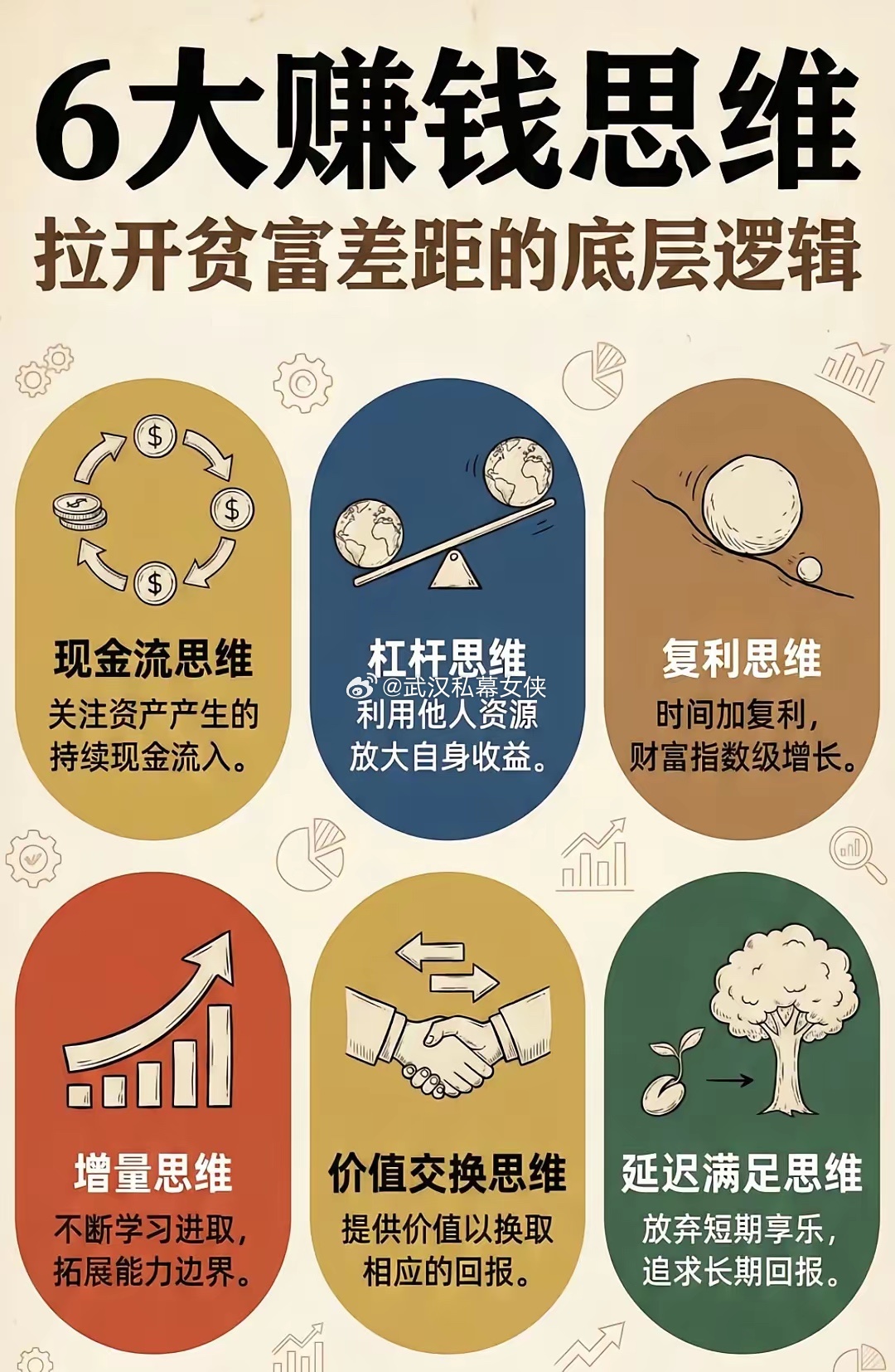 人与人之间的贫富差距,本质上是思维模式的差距。现金流思维让你持续造血,杠杆思维帮你放大收益,复利思维让时间成为财富的朋友;增量思维拓展能力边界,价值交换思维实现互利共赢,延迟满足思维锚定长期回报。掌握这6大赚钱思维,就是掌握了拉开贫富差距的底层逻辑。