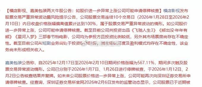 降温!降温!大牛股横店影视,嘉美包装再涨就要申请停牌了,这嘉美包装太厉害,好几次了,还能这么坚挺,这么疯狂,始终没搞明白炒作得底层逻辑是什么。横店影视是文化传媒板块最强高标,文化传媒板块连续两天暴涨,炒作得是AI视频逻辑,消息面厉害刺激。传媒板块之前炒作得是AI营销逻辑,蓝色光标,利欧股份等领涨。这波AI视频不会也像之前商业航天,AI应用一样,直接批量被爆头吧。都搞怕了,有得兄弟,商业航天爆头,AI应用爆头,资源股爆头,接下来AI视频......