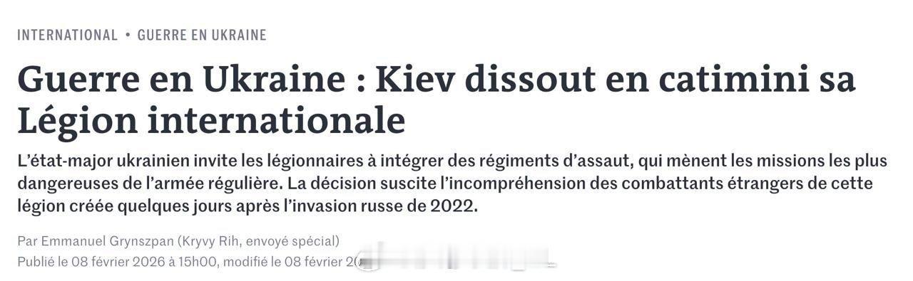 据该报报道,由于2025年雇佣兵的极大伤亡,“国际军团”的四个营里已有两个在去年11月被解散,两营剩余的大约100名雇佣兵被编入乌军第92旅和第475突击团等部队。第2营目前还有大约70%的满编率,不过他们中的很多人明确表示,如果乌军要解散第2营,他们就提桶跑路。