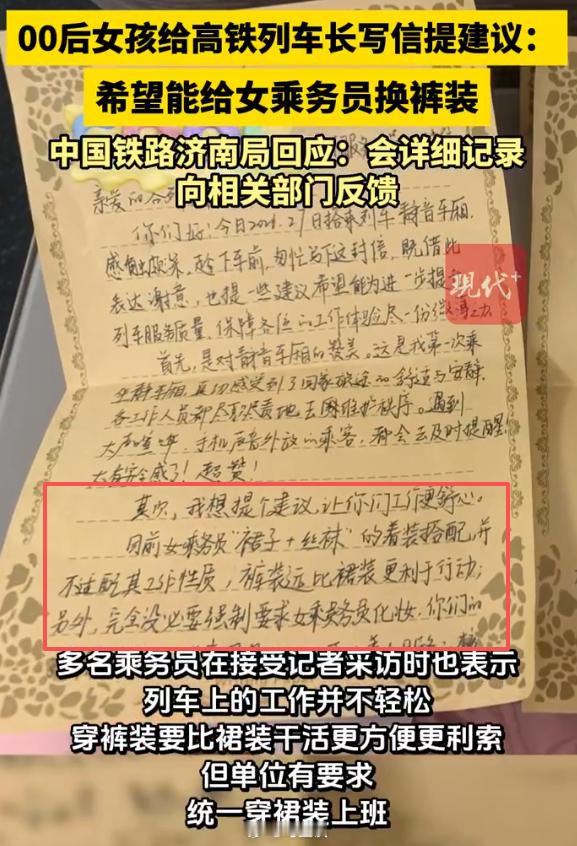 铁路回应女乘务员裙装换裤装建议 看了两页建议,挺棒,她不但提出无需强制裙装,还提出别强制化妆(男女都化)。但好像媒体和大V只把火力放在“裙装改裤装”,忽略了不要“强制化妆”,这是咋回事?这不是有违这么好心网友的初衷了么?