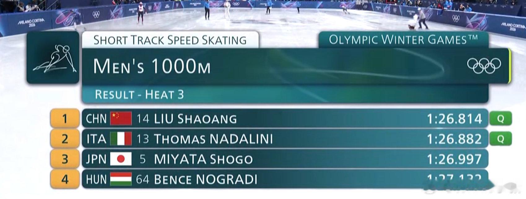 男子短道速滑1000米预赛 🇨🇳刘少昂第三组1:26.814小组第一 Q 晋级1/4决赛🇨🇳林孝埈第七组1:26.314小组第三 ADV 被判进1/4决赛🇨🇳孙龙第八组1:25.339小组第二 Q 晋级1/4决赛一会混接好运吧刘少昂林孝埈孙龙全员晋级林孝埈1000米预赛被判晋级