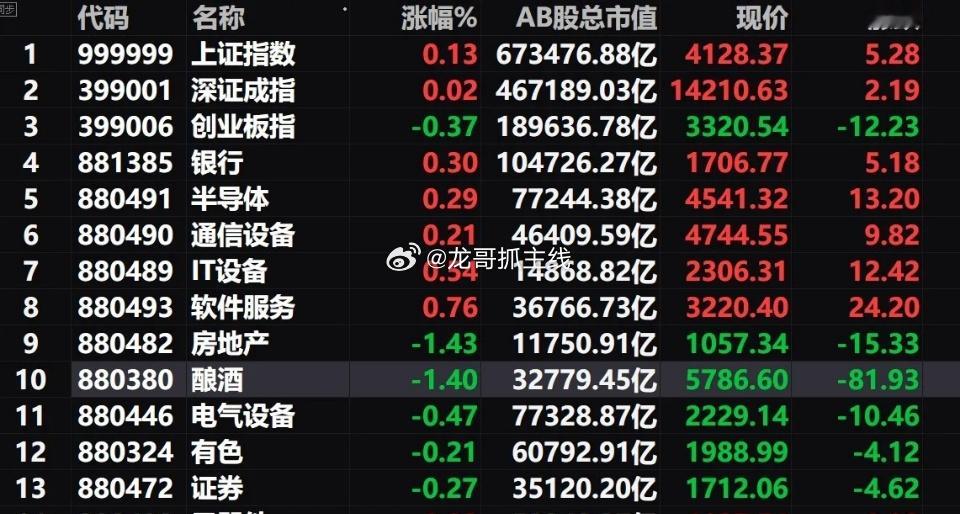 二、今天支撑大盘走势的行业大市值板块主要为银行及半导体通信设备等科技板块,但可惜的是涨幅不大,大盘也只能是小涨了,而今天传统行业板块纷纷走低,其中房地产、酿酒等板块位于领跌位置,跌幅分别达到1.43%、1.40%,对酿酒板块请大家远离为宜。